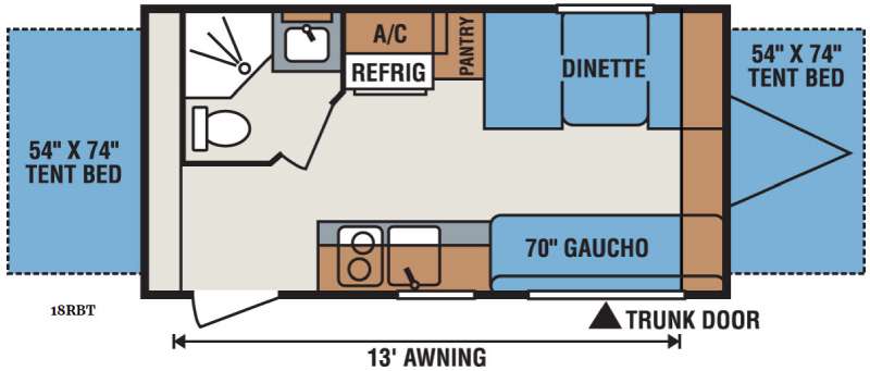 You will find plenty of overhead cabinets throughout the inside of the expandable as well as exterior storage with the trunk door. You will enjoy the shade from the 13' awning that covers the entry.