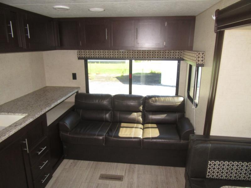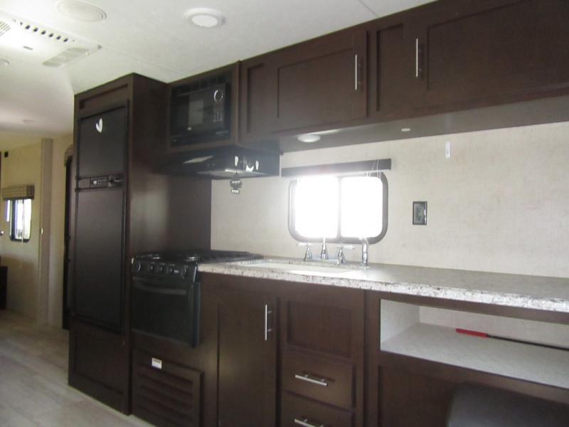 The combined living and kitchen area offers all the amenities needed for a short or long camping trip. Along the curb side wall the kitchen includes a pantry, refrigerator, three burner range, microwave, and double sink for easy clean up. The counter stretches to the rear of the trailer providing plenty of prep space for making or serving meals.