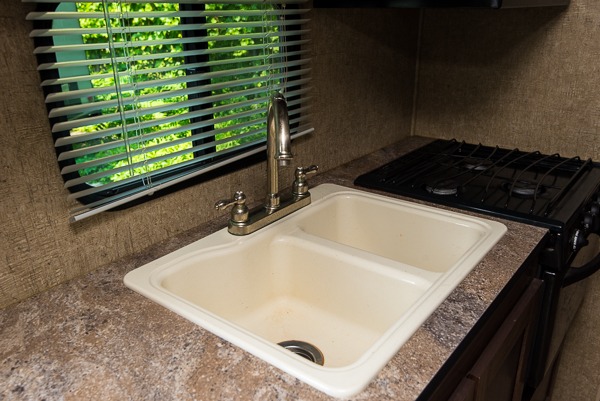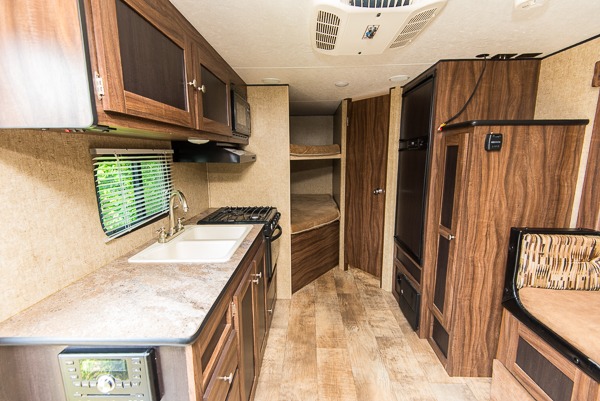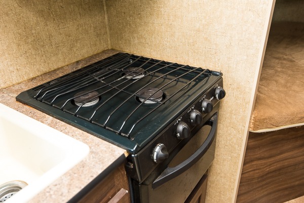 The kitchen area has a double kitchen sink, three burner range, and microwave on one side of the travel trailer. The other side of the travel trailer has a u-dinette slide, pantry, TV mount, and a refrigerator.
