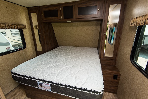 As you enter the travel trailer, to the right is a comfortable queen bed with two wardrobes, one on either side of the bed, and storage can be found above the bed.