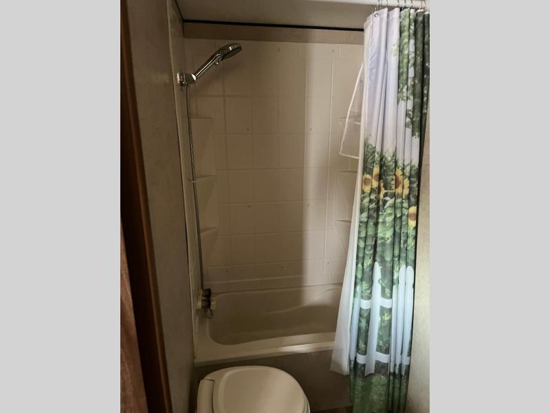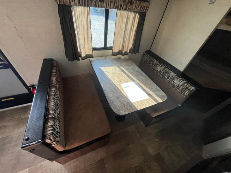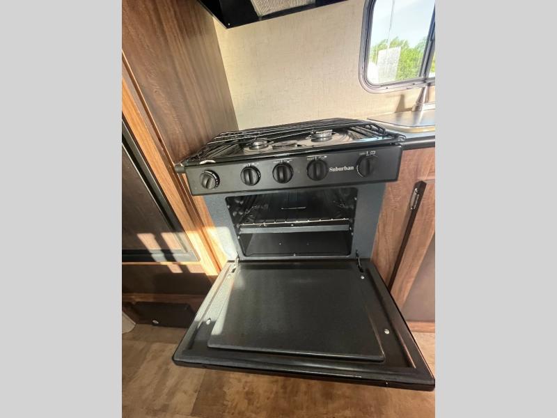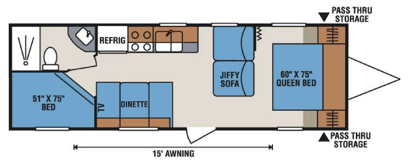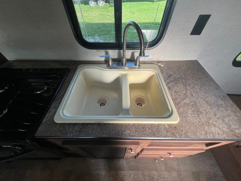As you enter the trailer, straight in front of you is a jiffy sofa which faces the rear of the trailer. Along the curb side you can enjoy your meals around the dinette. Above the dinette there is a TV and overhead cabinets. On the opposite side find a double kitchen sink, four burner range, overhead cabinets, and a refrigerator.