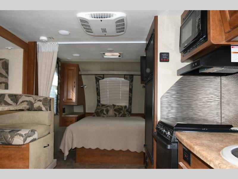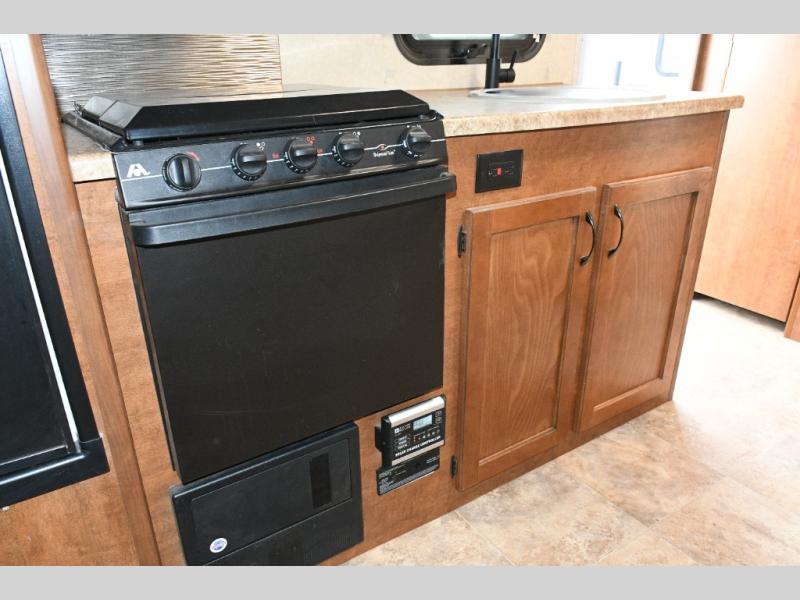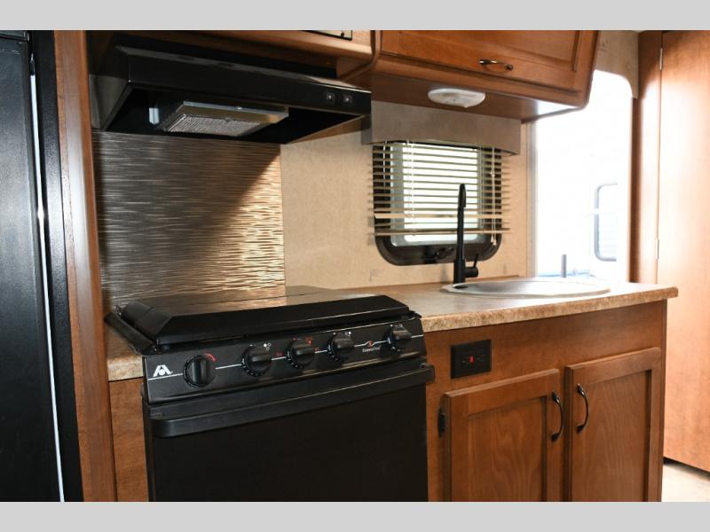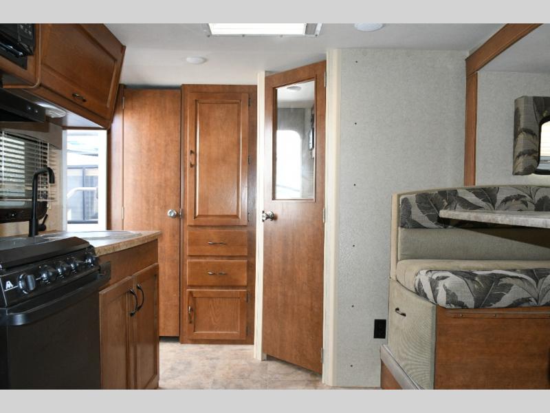 To the right of the entry door, the kitchen area features a single sink, three-burner range, refrigerator, and ample overhead cabinets so you can store dishes, pantry items, and cooking essentials. Whether you’re preparing quick snacks or full meals, everything you need is within reach.