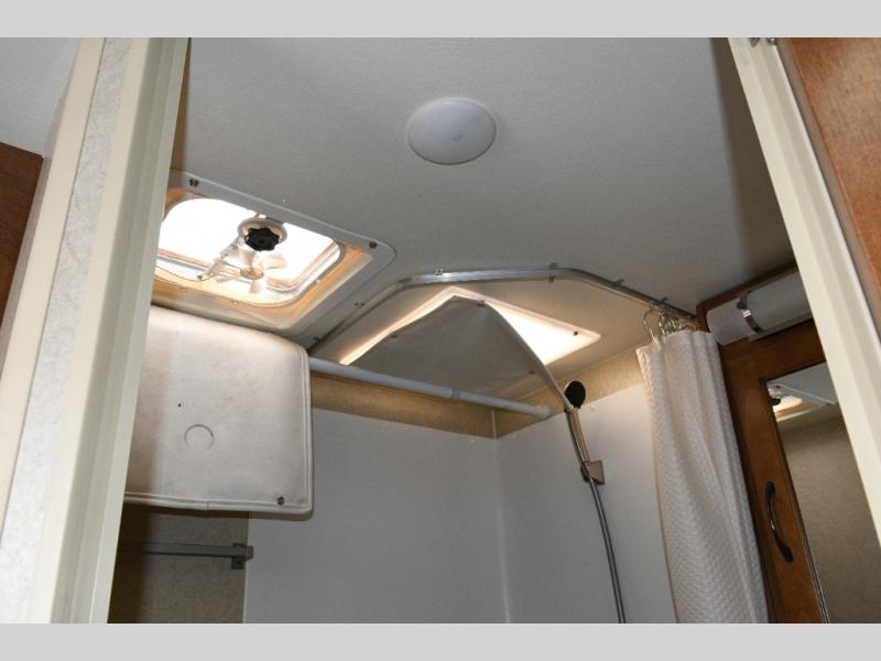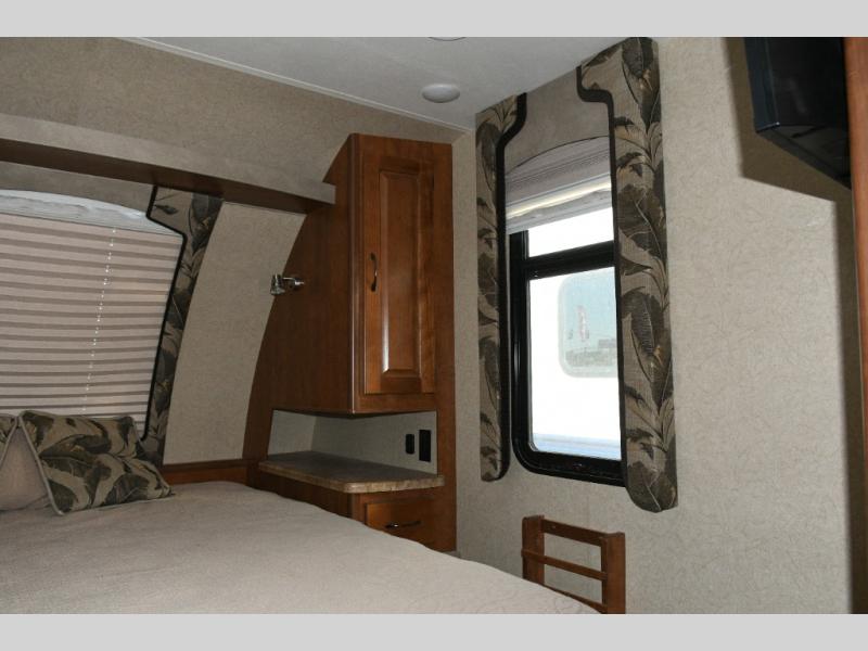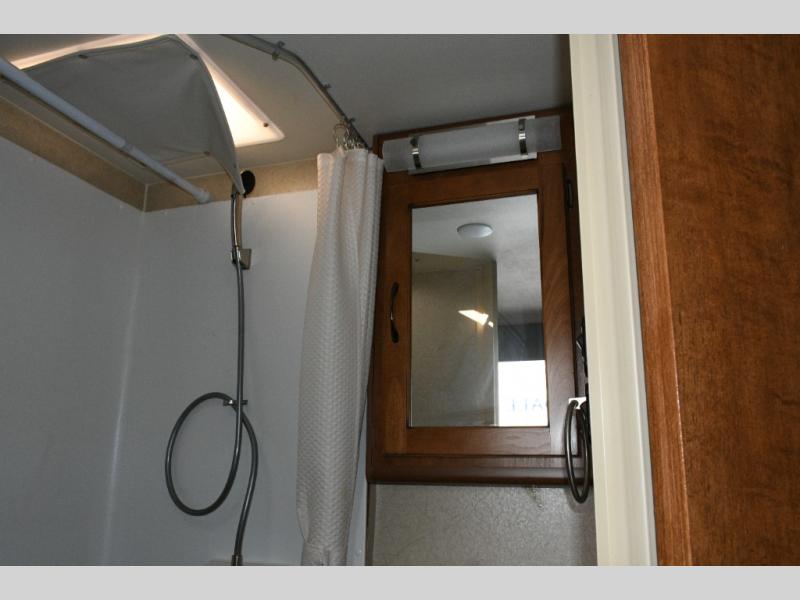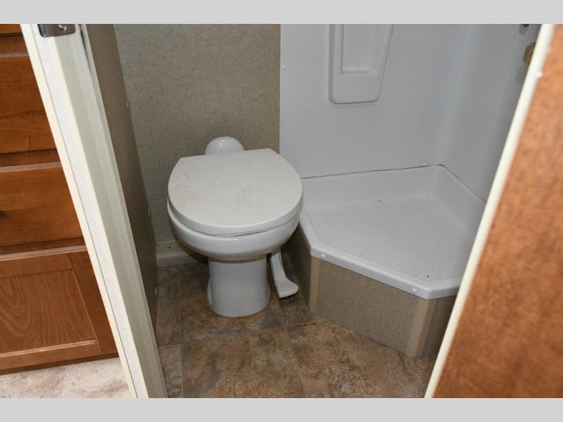 Step inside and you’ll find a smartly designed interior that maximizes every inch of space. Just to the left of the entry door are convenient storage cabinets and a shirt wardrobe, giving you a place to keep clothing and camping gear organized. Toward the rear, the corner bathroom includes an angled shower, toilet, and vanity with a medicine cabinet, providing all the comforts of home while you travel.