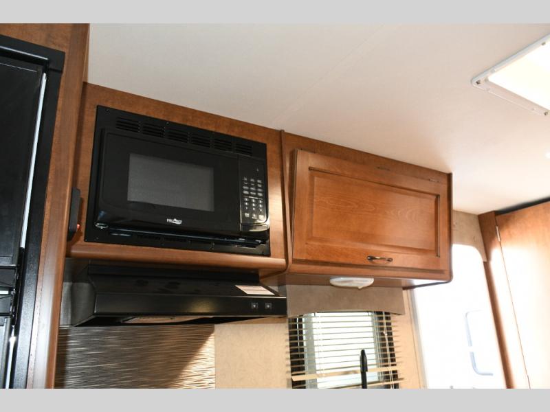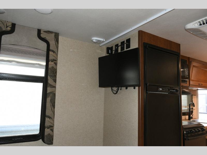 Up front, the comfortable queen bed provides a peaceful place to recharge. With wardrobes and nightstands on both sides, overhead storage, and a privacy curtain, this space offers both comfort and practicality. There is also a designated spot for an optional TV near the refrigerator for added entertainment on the road.