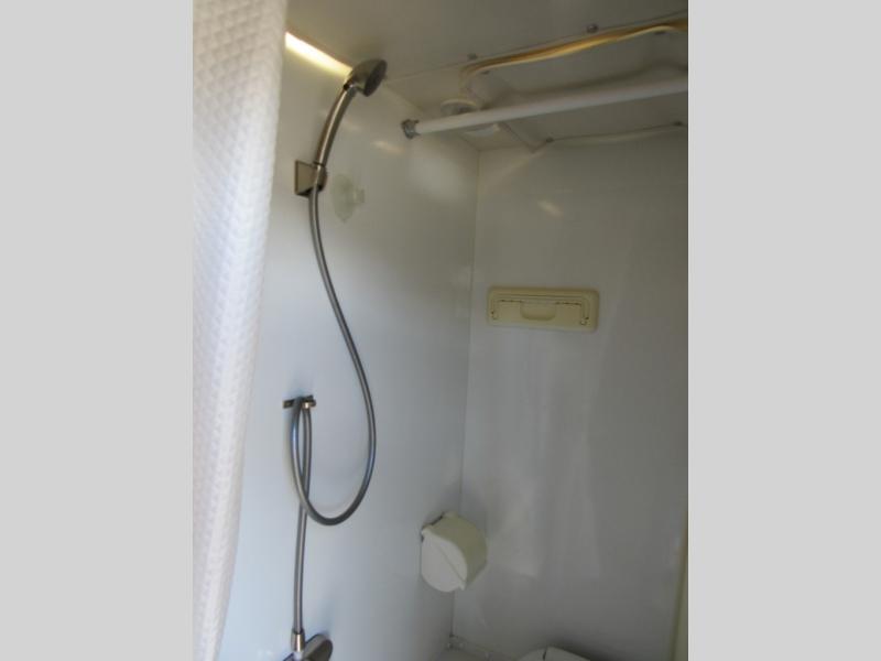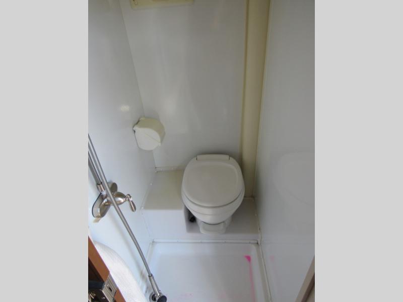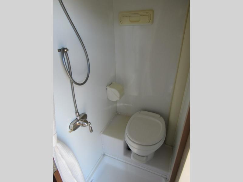 The wet bath opposite the dinette features a toilet, sink, and shower. A handy wardrobe can be found just outside the bathroom door along the road side.