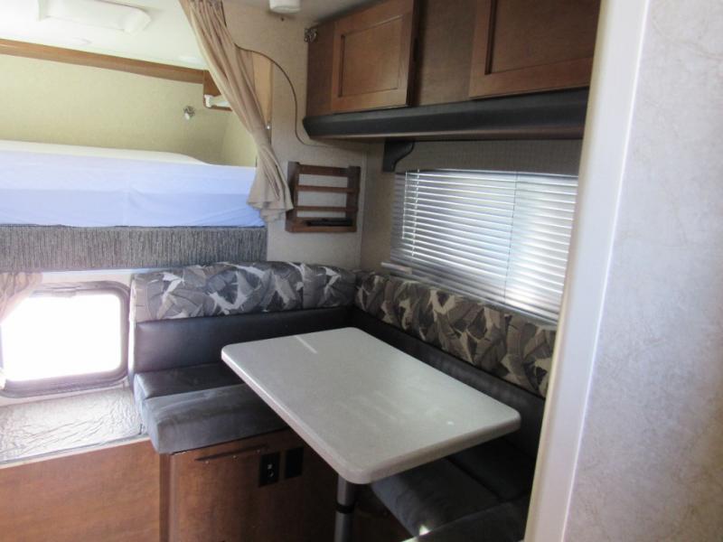 Step inside the rear entry door and see a nice sized u-shaped dinette on the right side with plenty of seating for everyone. When the day is done, and more sleeping space is needed, the dinette can quickly be converted to a 32" x 72" bed for one.