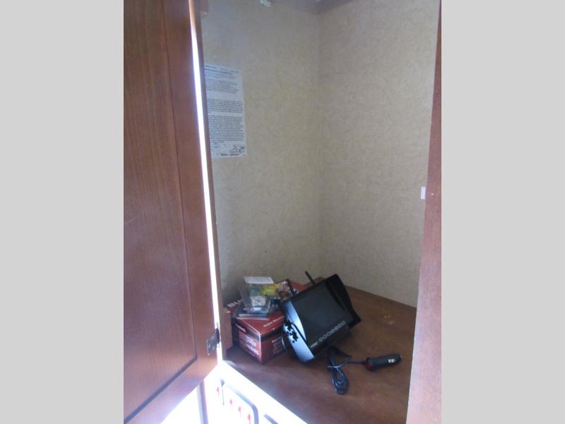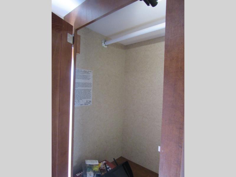 Lastly, step up to a front cabover queen size bed with overhead storage on the right side as well as space for some hanging clothes, plus so much more!