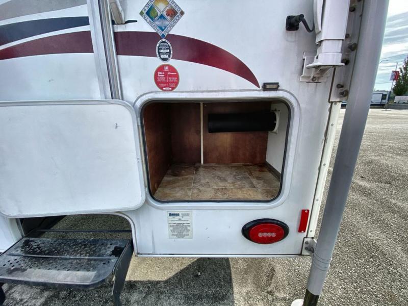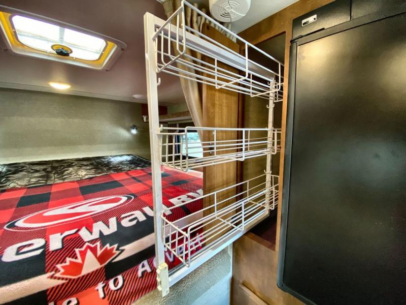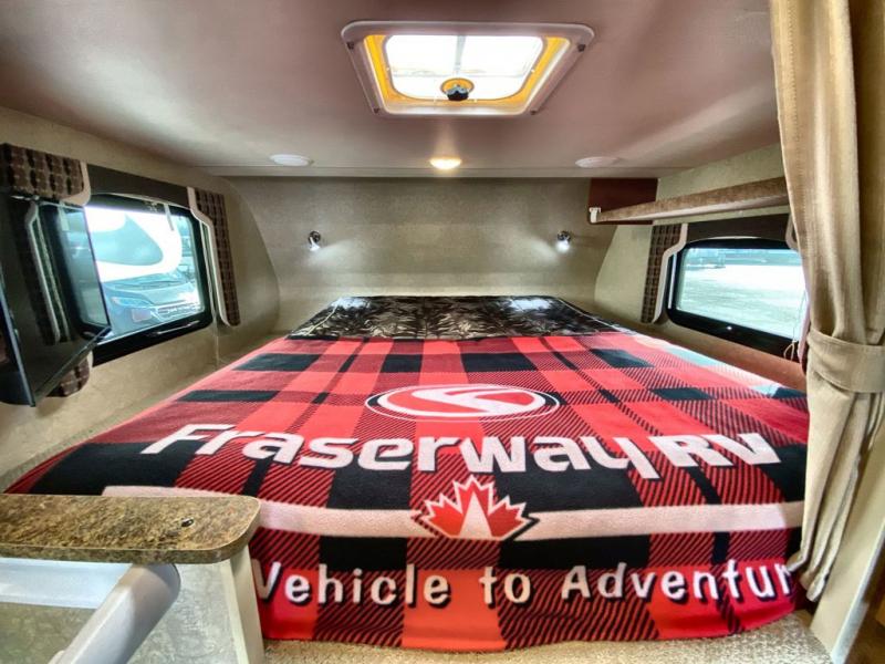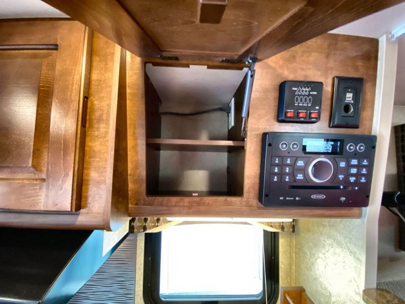 Lastly, step up to a front cabover queen size bed with overhead storage on the right side as well as space for some hanging clothes, plus so much more!