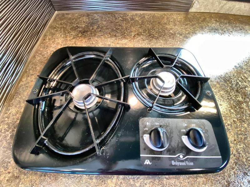 Cook light meals and snacks easily in this Lance 865 kitchen which offers a two burner range, a pantry with adjustable shelves, and a 3-way 3 cu. ft. refrigerator and single sink with high spout faucet. You can add a microwave oven, a slide out pantry, or a sink cover if you like.