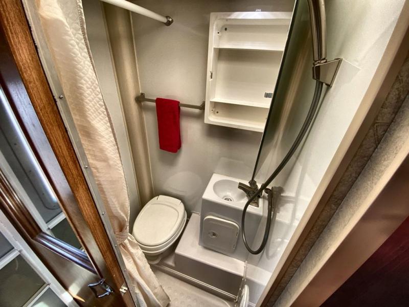The wet bath opposite the dinette features a toilet, sink, and shower. A handy wardrobe can be found just outside the bathroom door along the road side.