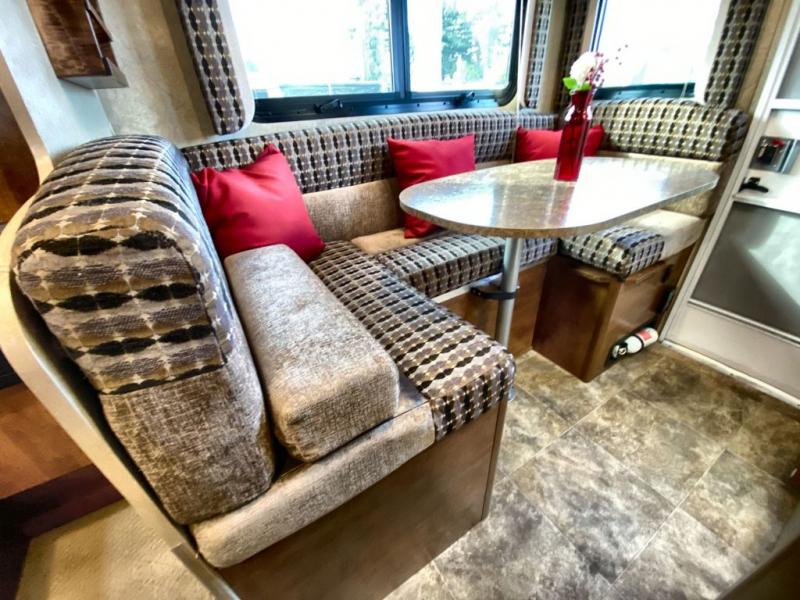 Step inside the rear entry door and see a nice sized u-shaped dinette on the right side with plenty of seating for everyone. When the day is done, and more sleeping space is needed, the dinette can quickly be converted to a 32" x 72" bed for one.