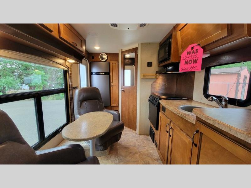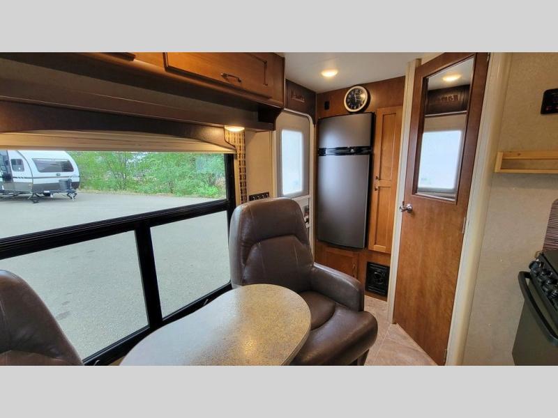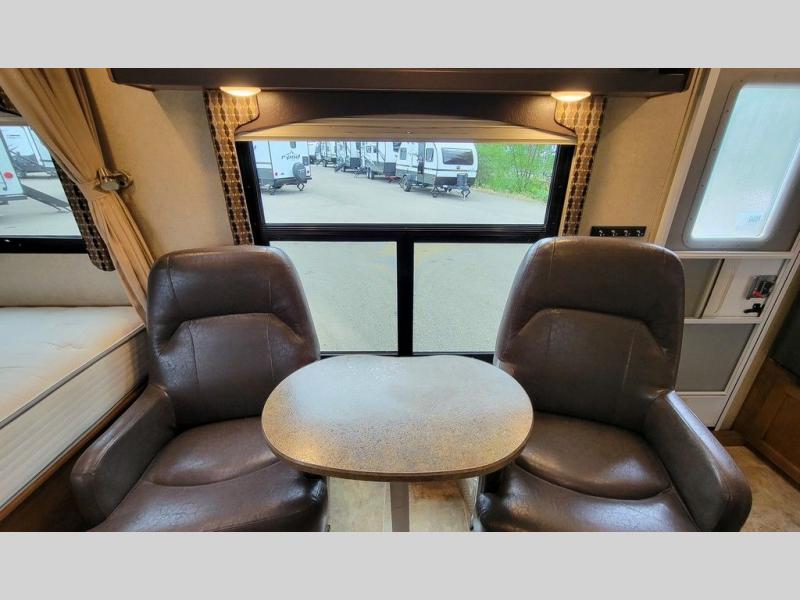 When it's time to sit and relax, or grab a bite to eat, the dual swivel rockers with table between may become your favorite spot in the trailer. You are sure to enjoy the overhead cabinets as well for all of your storage needs.