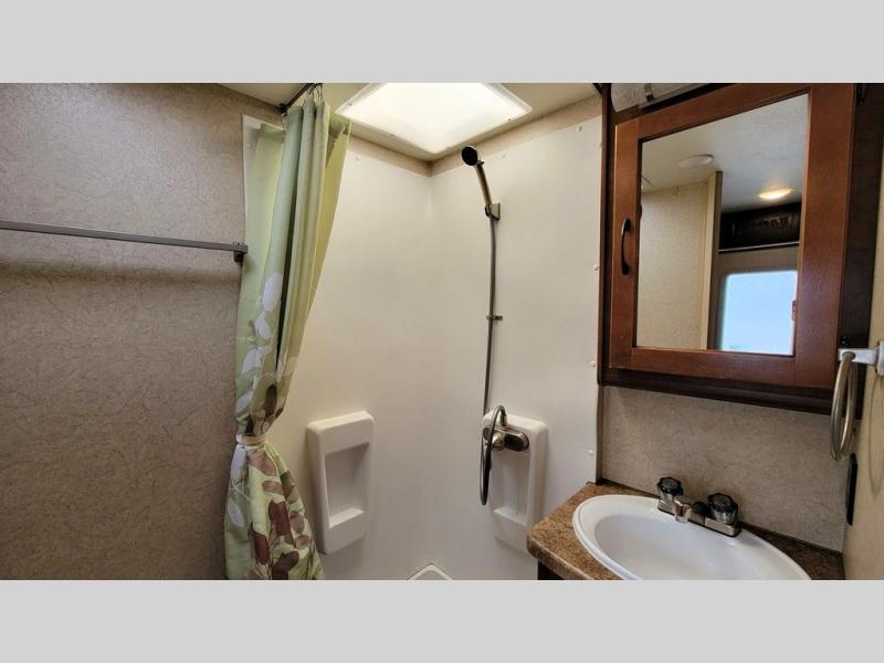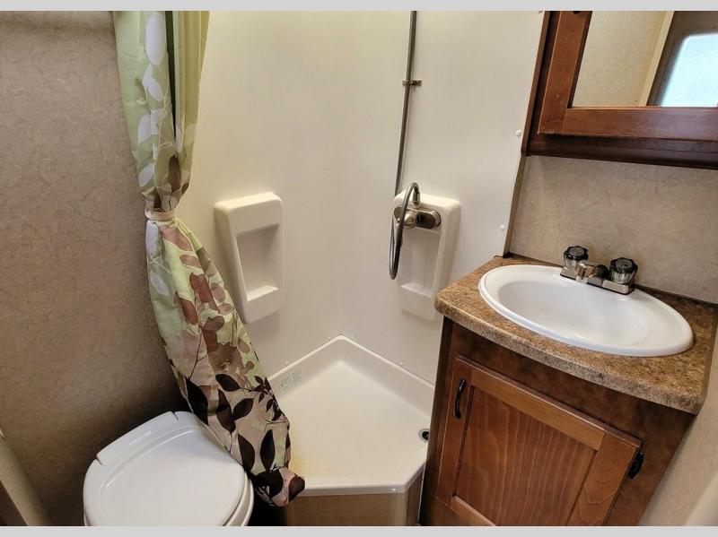The front features a queen size bed with a shelf along the front wall for additional storage. An optional TV, and additional raised counter space can be found between the sink and bed.