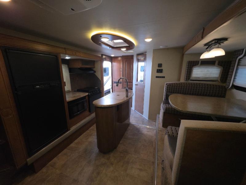 Along the curb side wall you will find a slide out with a three burner range, counter space, overhead cabinets for storage, and a refrigerator. A much desired kitchen island features a large rectangle sink for easy clean up, and additional counter space for preparing and serving meals.