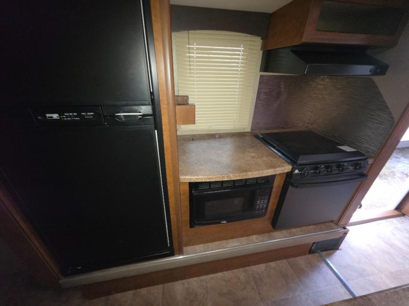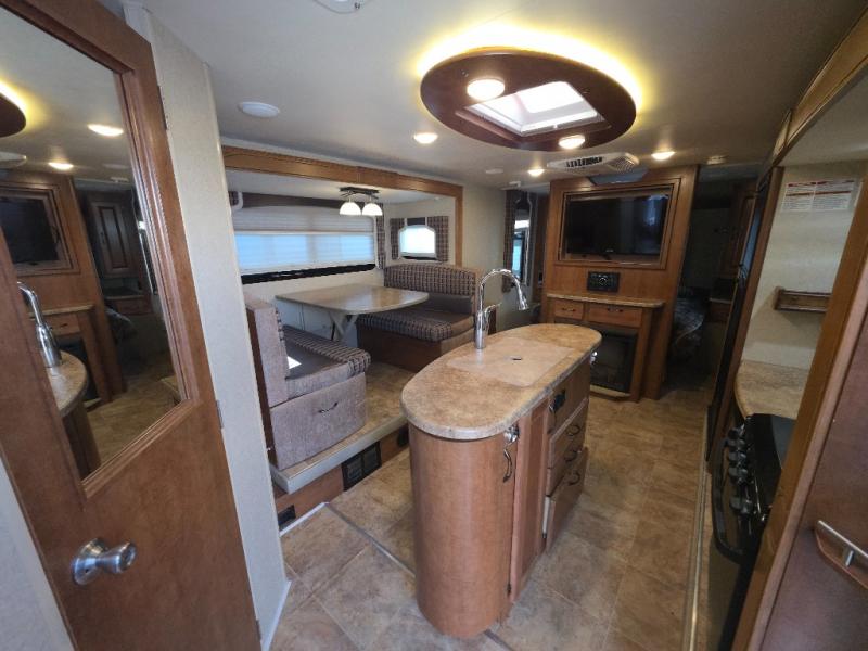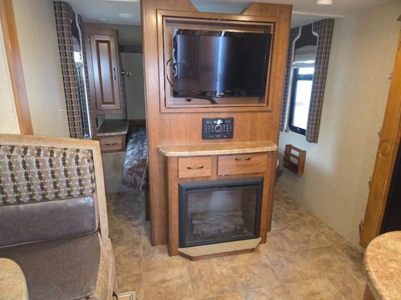 The second slide features a booth dinette along the road side wall providing extra floor space. A handy countertop is next to the dinette to lay your keys or other personal belongings. You are sure to enjoy the entertainment center and optional TV and/or fireplace located just off the foot of the bed in front when relaxing inside.