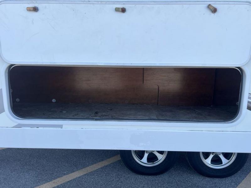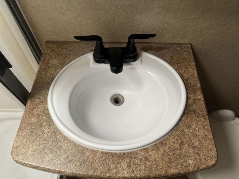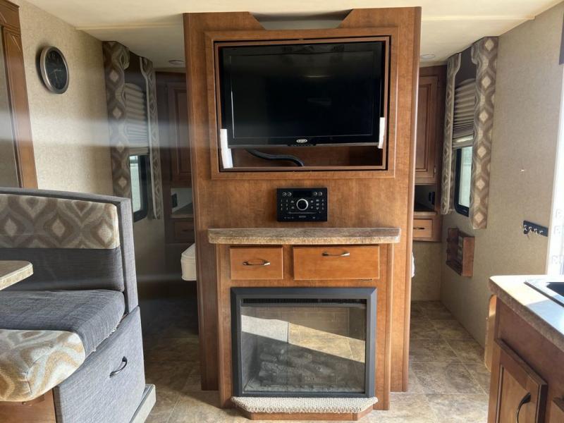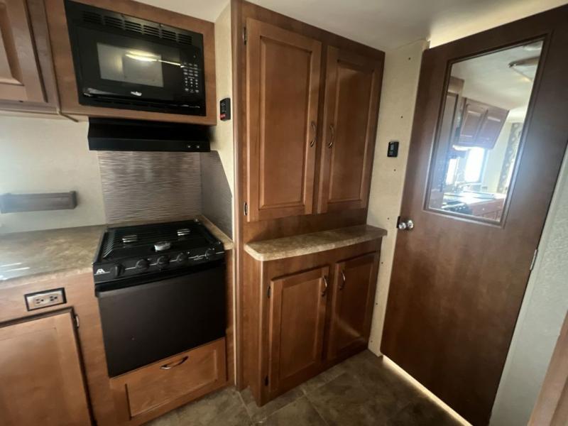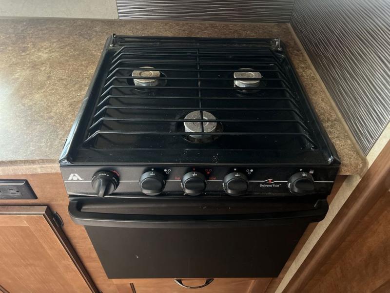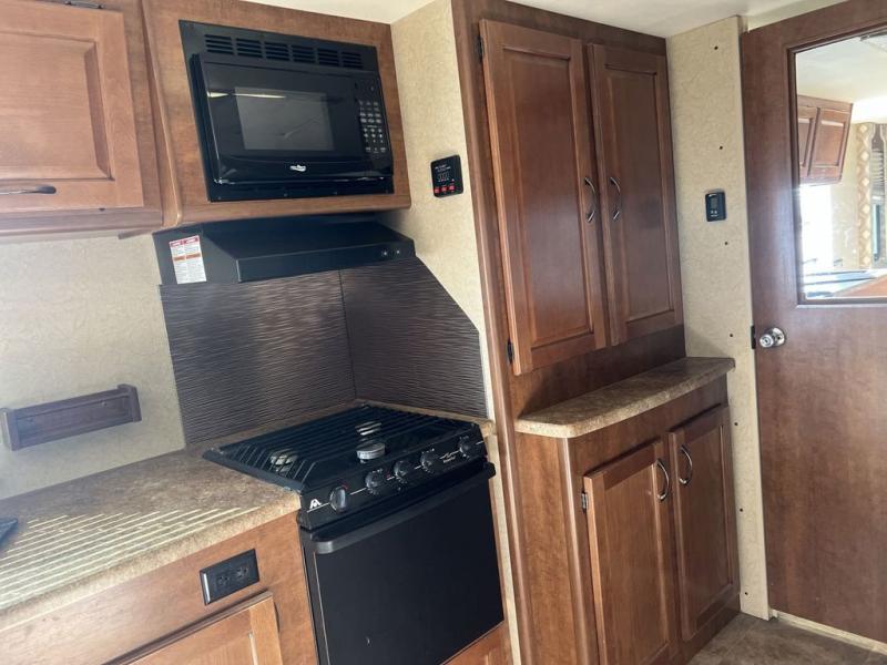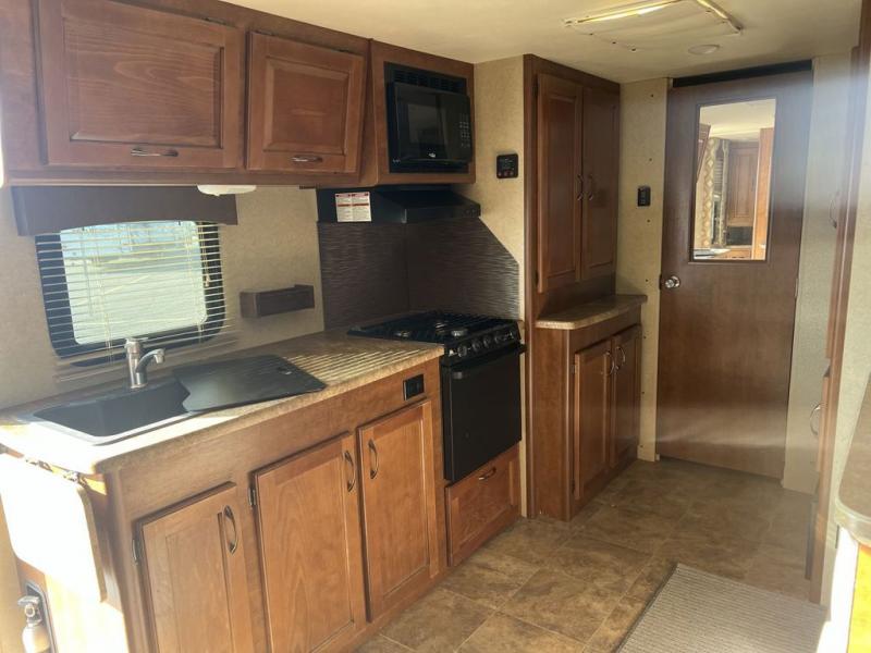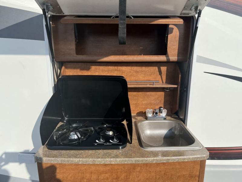 On the outside you will enjoy a slide out kitchen featuring a two burner stove top, sink, and overhead storage. The perfect feature for those who like cooking and dining outside, plus so much more!