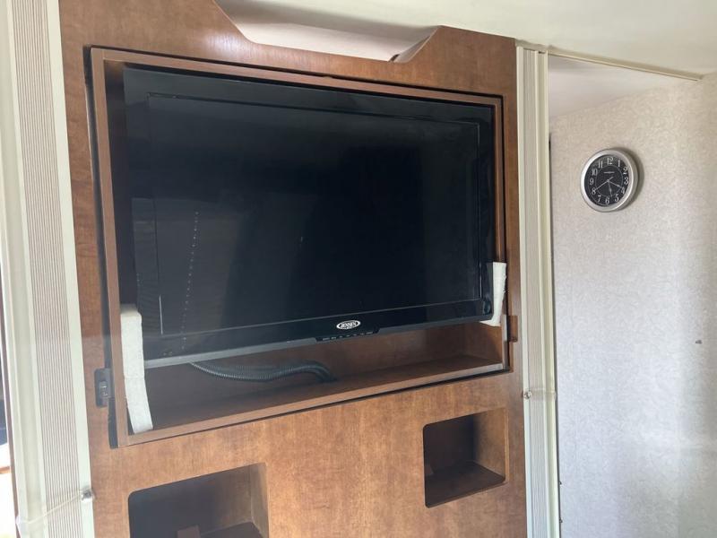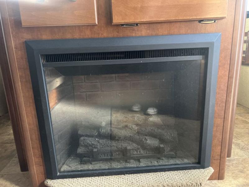 In the main living area there is a large slide out u-shaped dinette for convenient dining. The dinette can also be easily made into additional sleeping space at night when the table is folded down. A entertainment center with optional TV and fireplace are on the interior wall just off the foot of the bed for easy viewing from this combined kitchen and living room space.