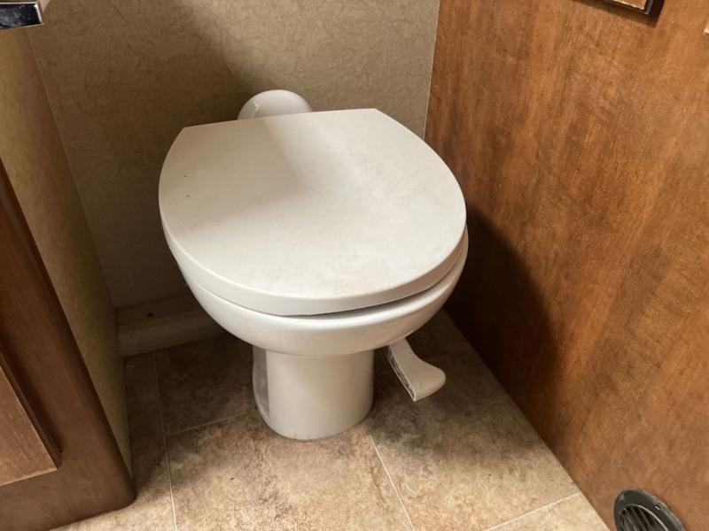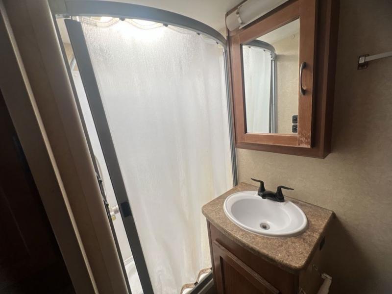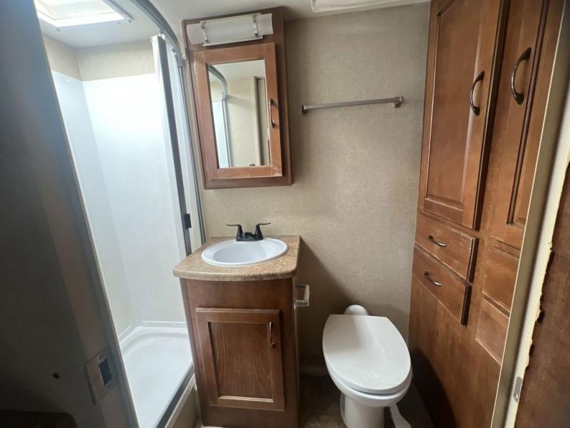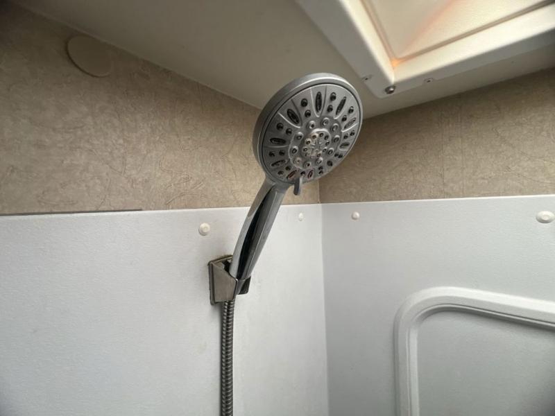 The rear bath provides everything needed for getting cleaned up. There is a full shower, a sink and toilet, plus plenty of cabinet space for your linen and things. Just outside the bath door there is a shirt wardrobe and extra cabinet space.