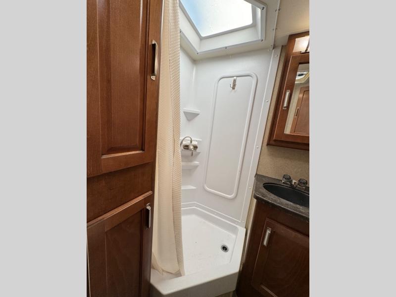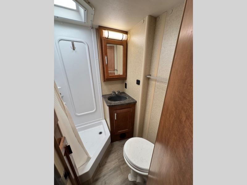 As you continue toward the front you will enjoy keeping clean and refreshed with the side aisle bath including an angled shower, a toilet, and a vanity with sink including overhead medicine cabinet.