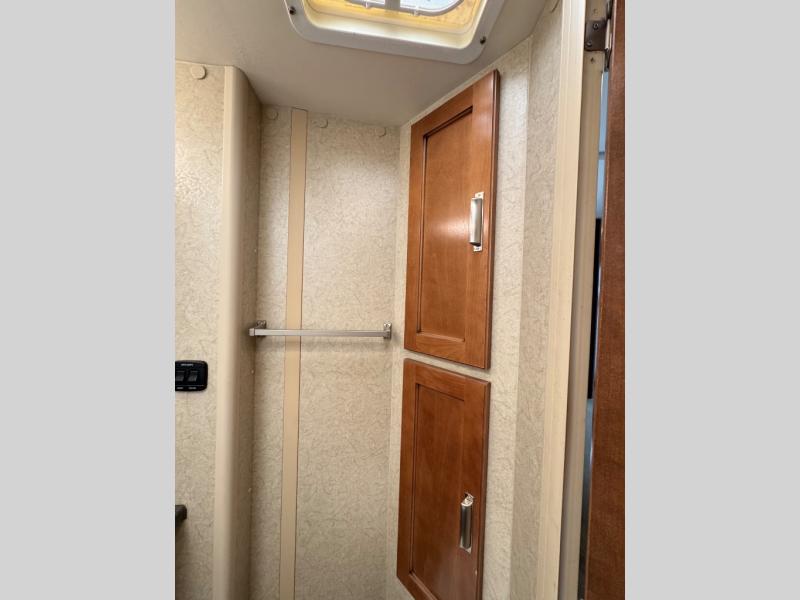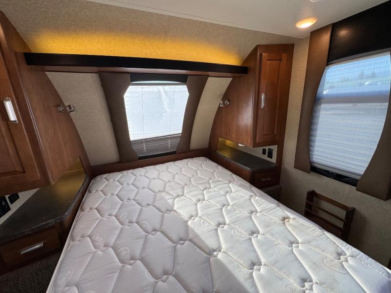 The very front of this Lance camper features a queen size bed plus dual bedside shirt closets and nightstands. There is also a space for an optional TV.