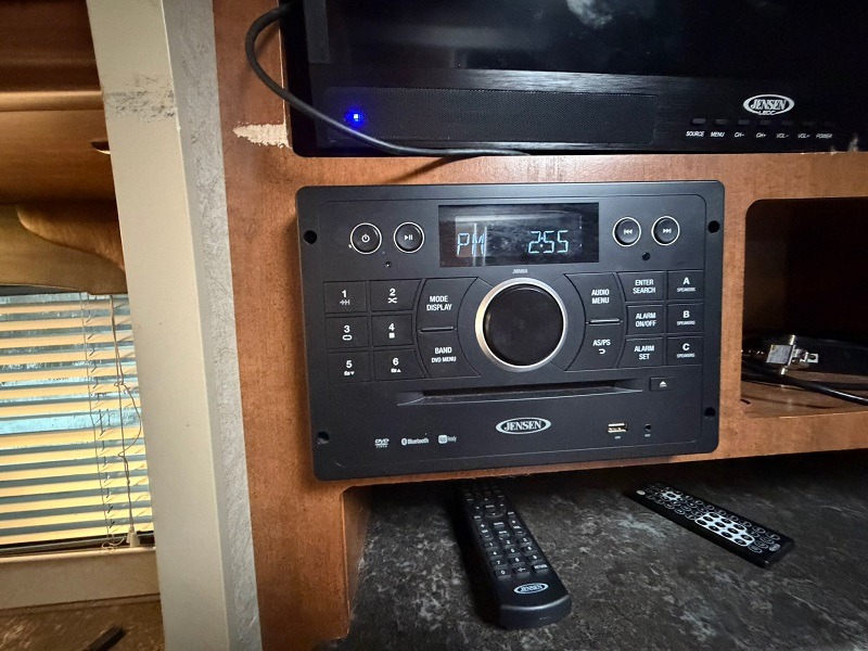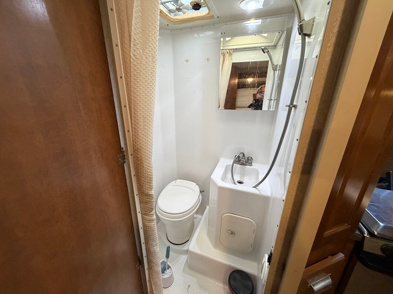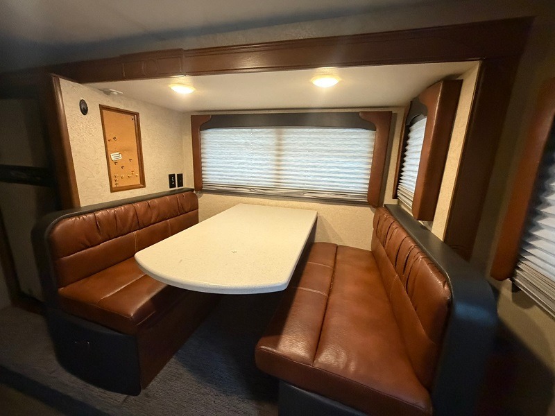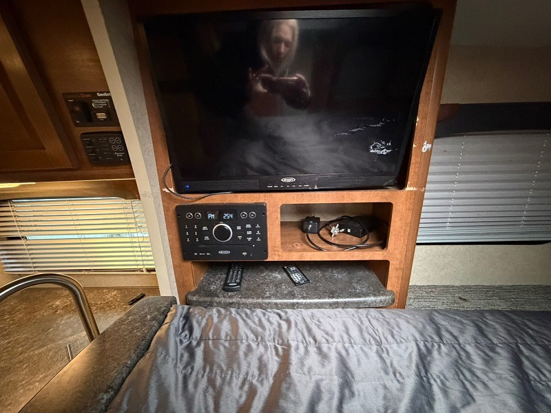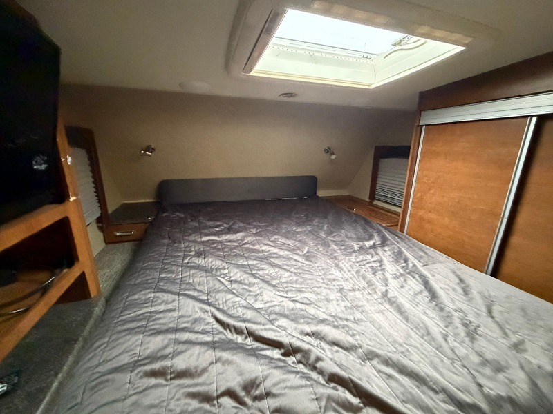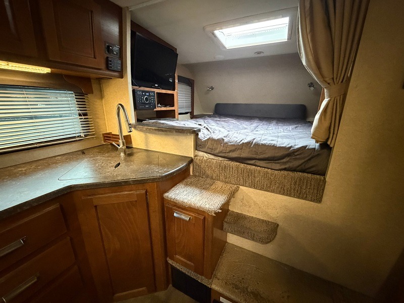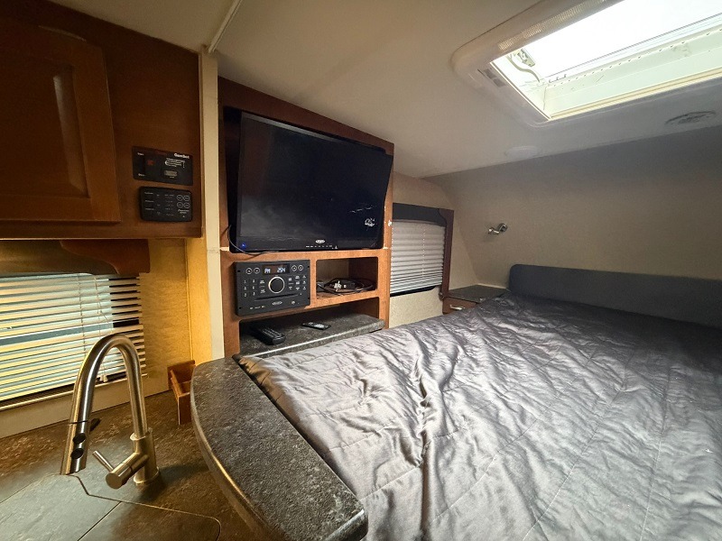 Step up to a queen size bed with an entertainment center on the left side where you can add a 24" LED 12 volt TV. There is a wardrobe opposite the entertainment center, along with a hamper towards the front. There is also a small storage cabinet in the upper left corner so you can keep things neat and tidy while you are camped.