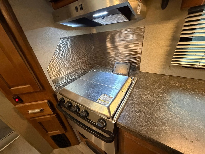Outside the bathroom, along the left side is the kitchen area where you can easily cook up meals and snacks while you camp. There is a pantry for dry good storage, a three burner range, a double sink, overhead storage, and a trash can. You can add a microwave oven if you like, or slide out pantry.