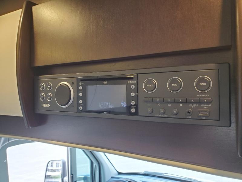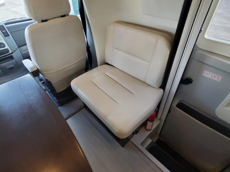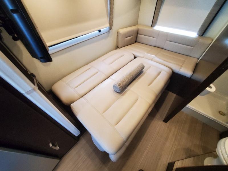 You will enjoy plenty of seating with a belted chair to the right of the door, the passenger and driver seats swivel to the back when parked, and there is an L-shaped bench behind the driver's seat for plenty of space to enjoy meals and conversation with a pedestal table between.