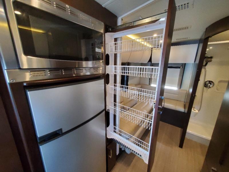 To the left of the entry door find a wardrobe for clothing, a refrigerator next, and a pull-out pantry for storage all along the curb side wall. Opposite find a counter with round sink, a range top and overhead storage, plus more storage in the cabinets and drawers below.