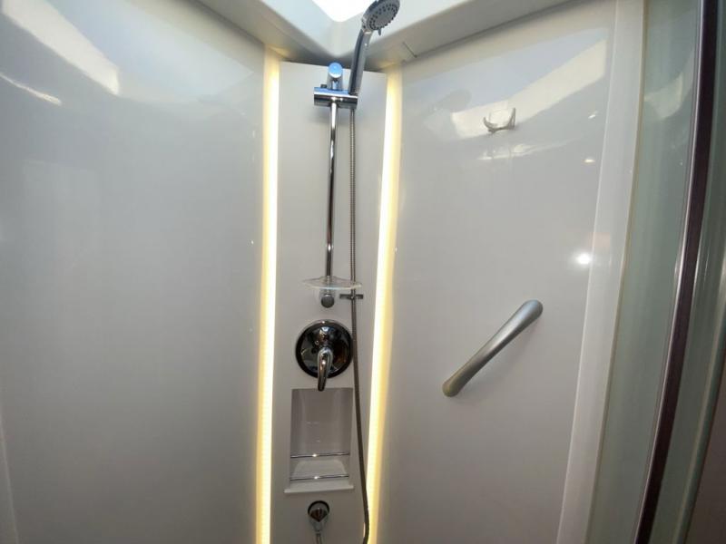 Head to the back where you will find a storage wardrobe for hanging clothes, and a spacious bathroom area including a toilet with overhead storage, a corner shower, and a sink with medicine cabinet above, plus so much more!