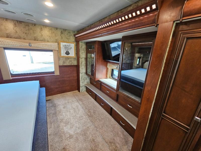 As you enter the motor home, to the left there is a double kitchen sink, three burner range, and refrigerator. Meal prep and clean up is a breeze with this kitchen! The opposite side of the motor home has a full wall slide with a 87" sofa, dinette, pantry, linen cabinet, and in the bedroom the slide continues with two shirt wardrobes, a chest of drawers, and an overhead TV.