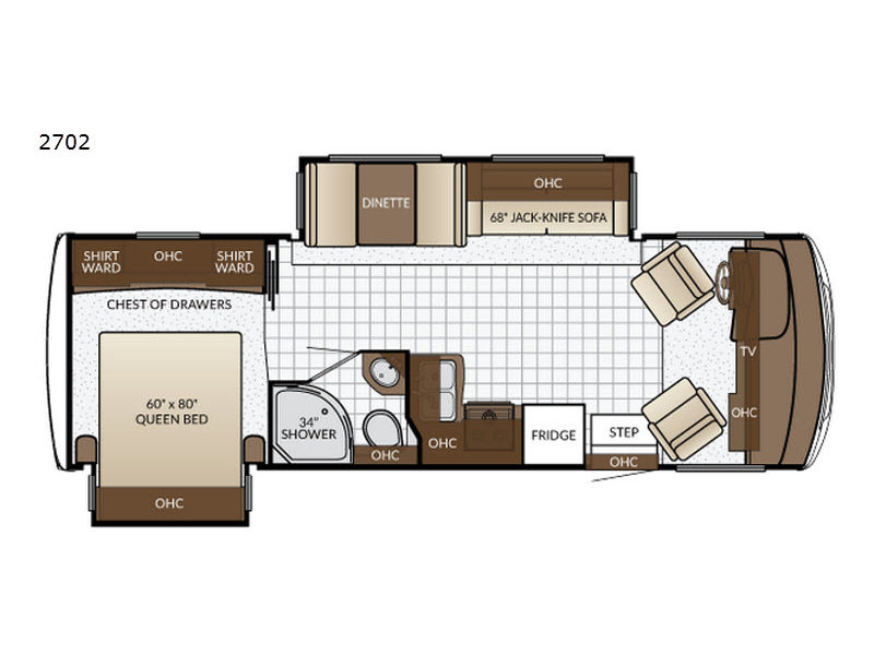 Both the driver and passenger seat swivel around for added seating, and above the cab there is an overhead cabinet/TV.