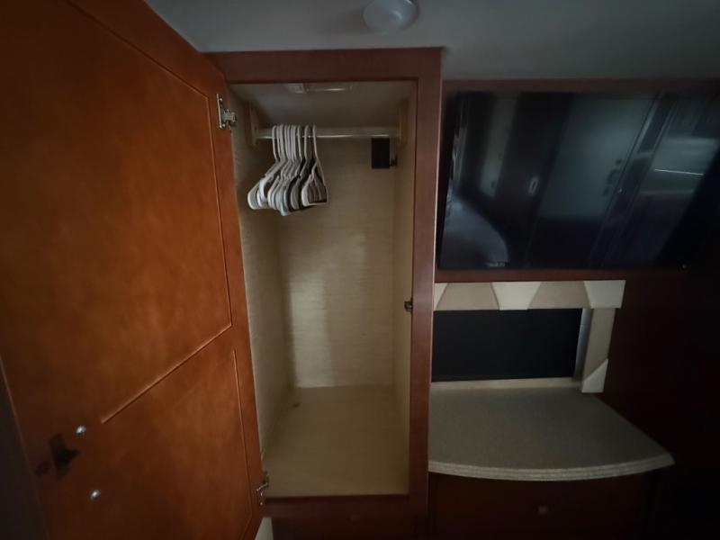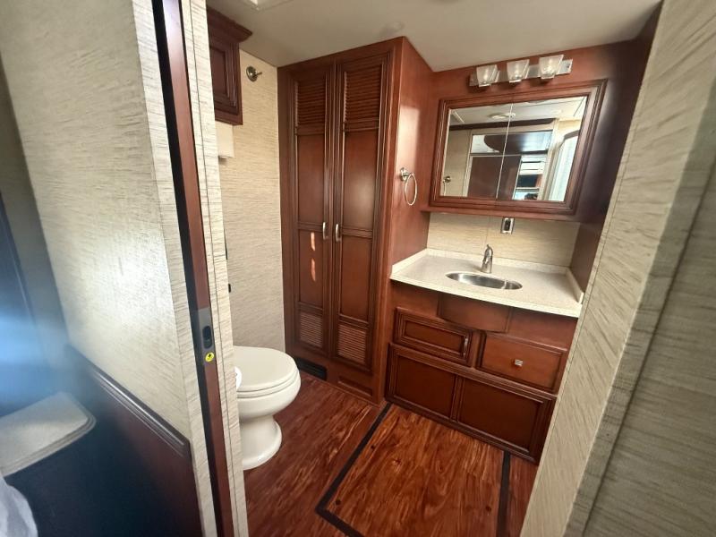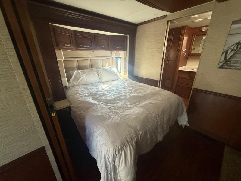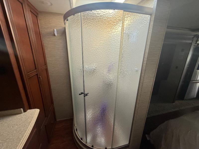 The walk through bedroom has a queen bed slide with nightstands on each side. In the rear of the coach is the master bath. There is a 36" corner shower and toilet, plus a wardrobe with bi-fold doors, sink with overhead cabinet, and wardrobe or washer and dryer along the rear wall, and so much more!