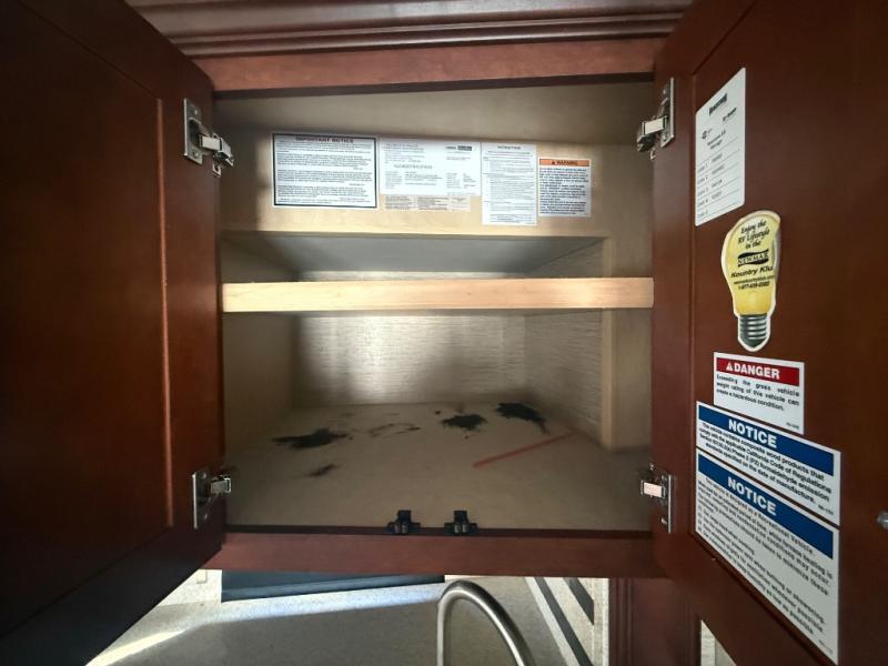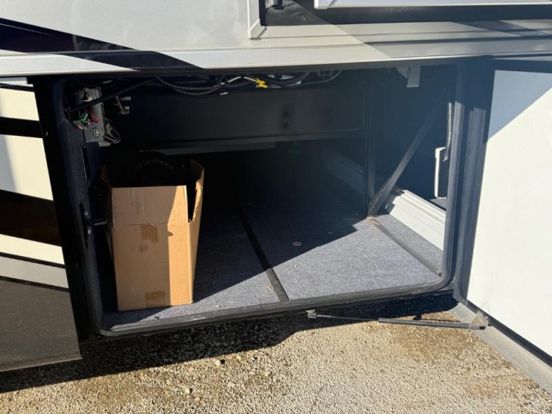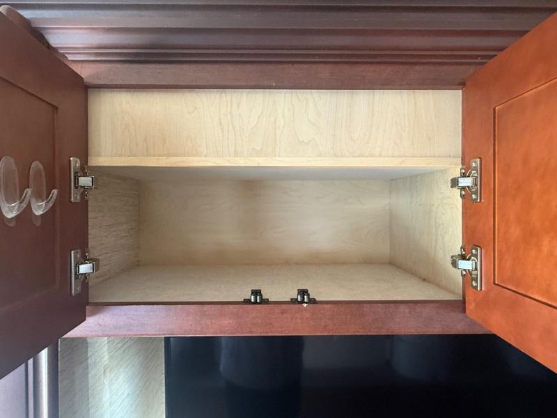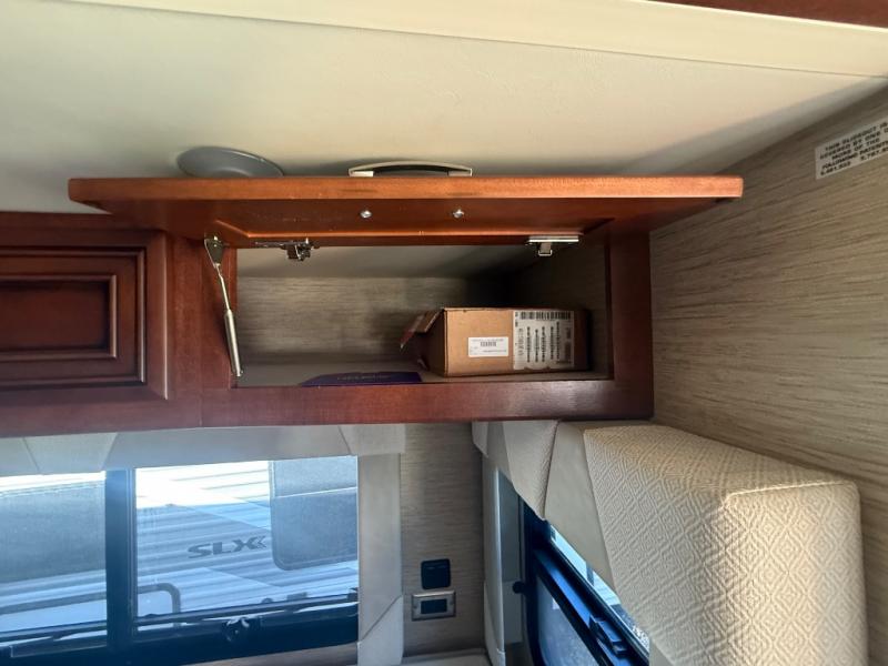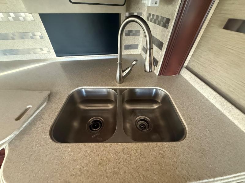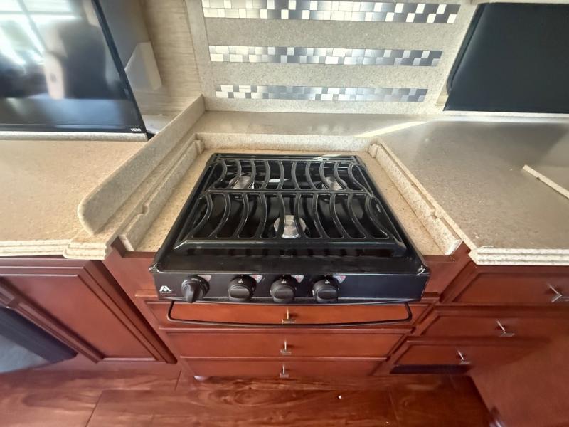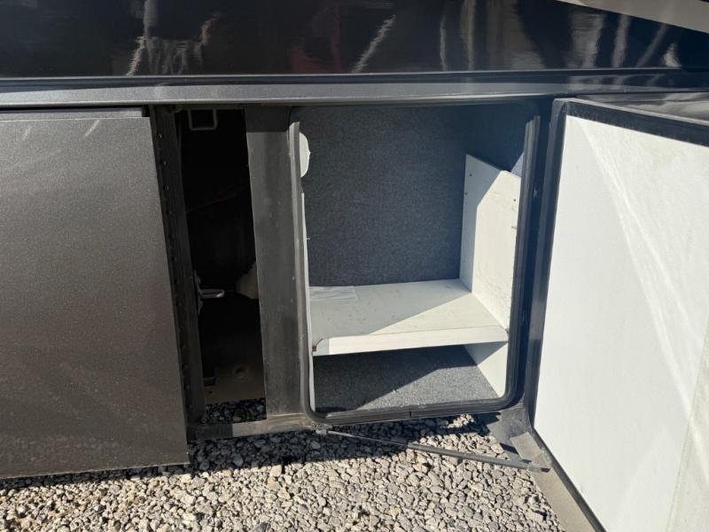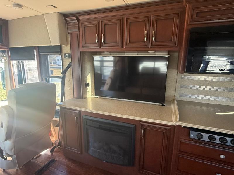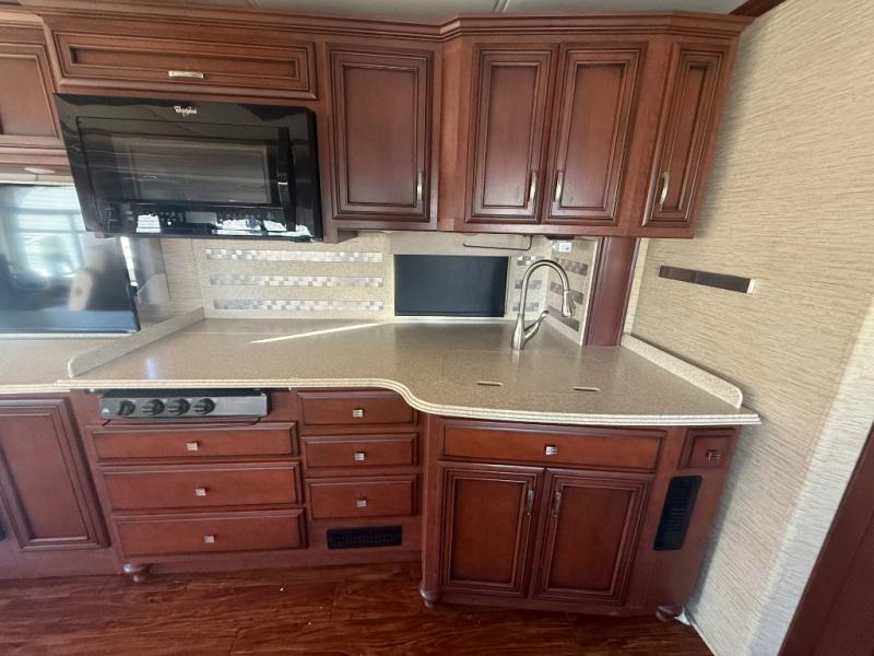 As you enter the coach, the full wall slide features a 74" hide-a-bed sofa, booth dinette, refrigerator, and pantry for your non-perishables, plus in the bedroom there are two wardrobes, chest of drawers, and an overhead TV. On the opposite side of the motor home there is a double kitchen sink on an angled countertop, three burner range, fireplace with LED TV on a power lift, and overhead cabinets stretching the whole length of the slide out.