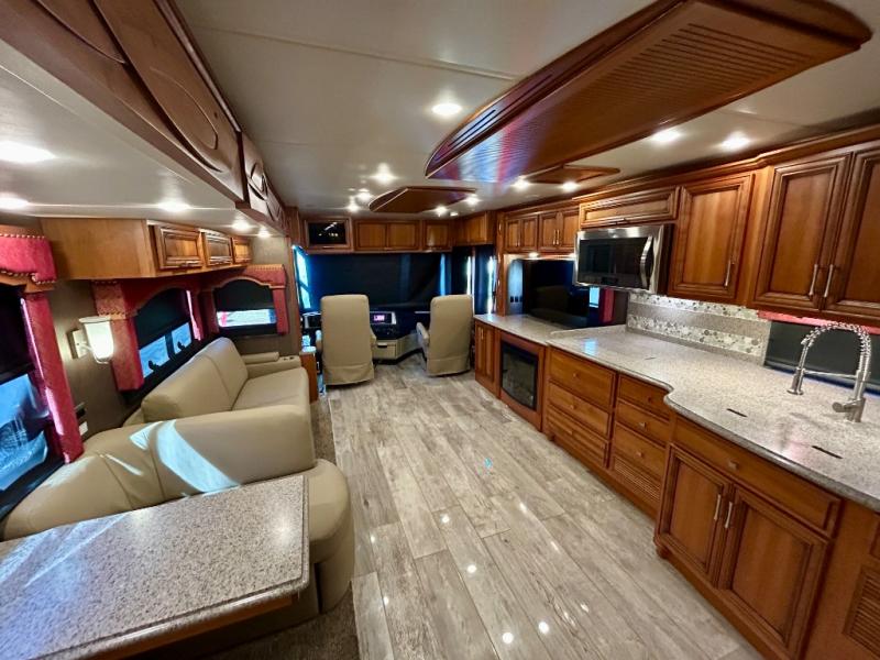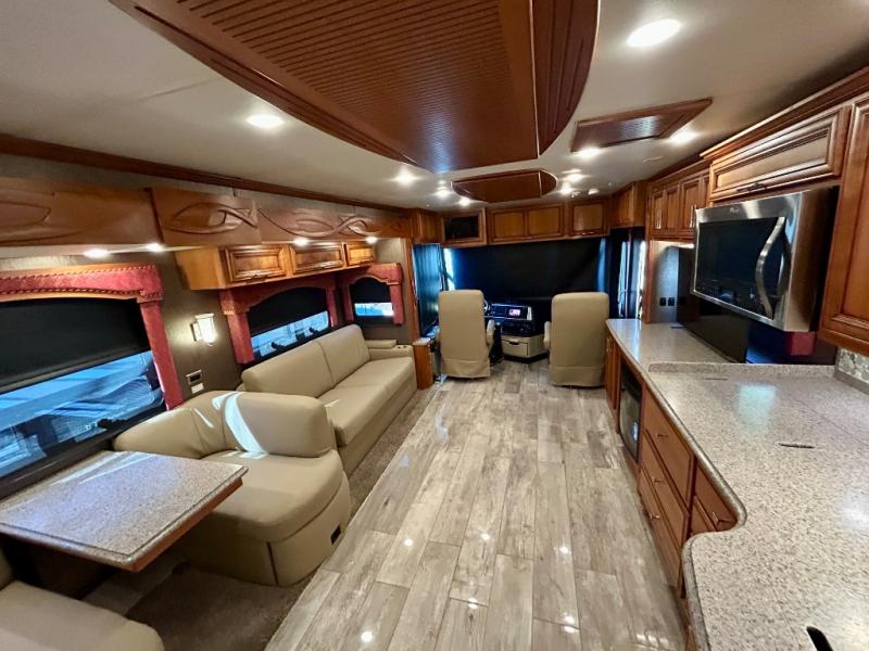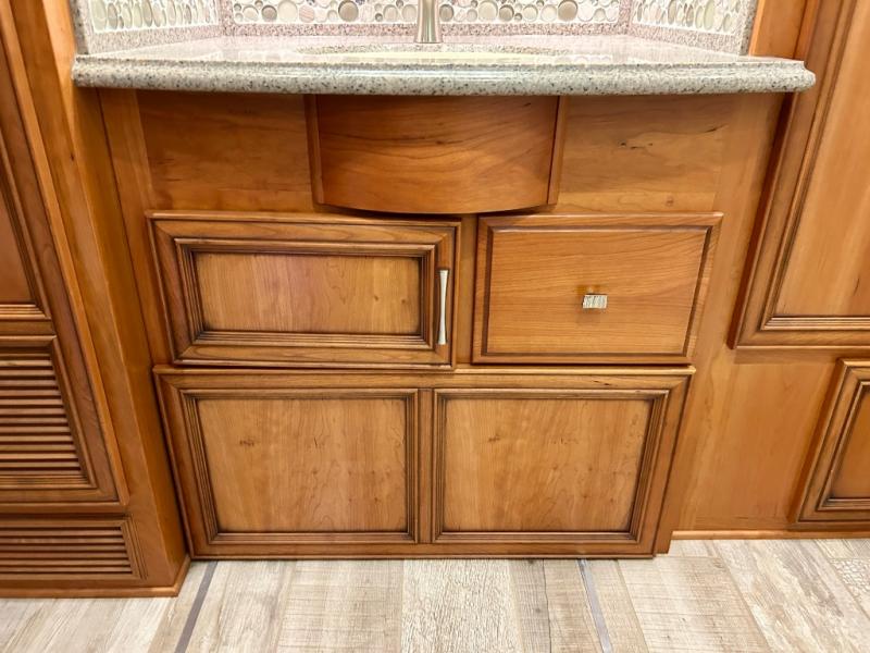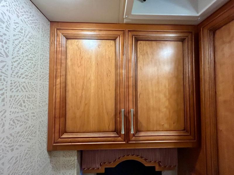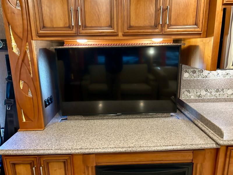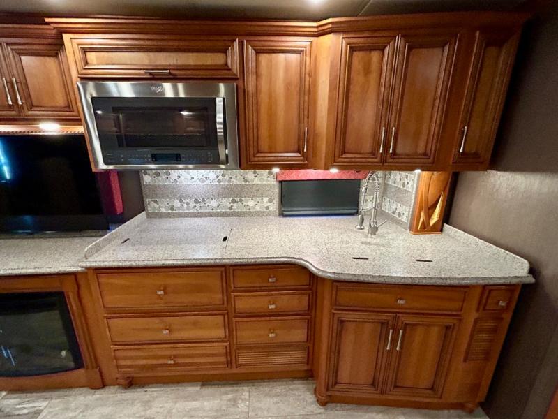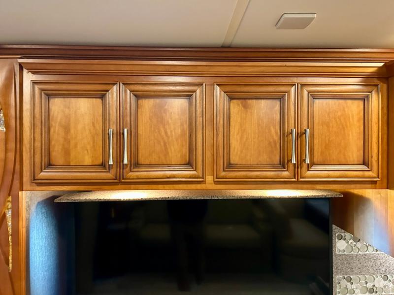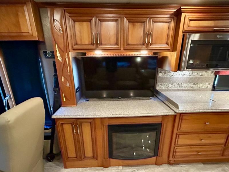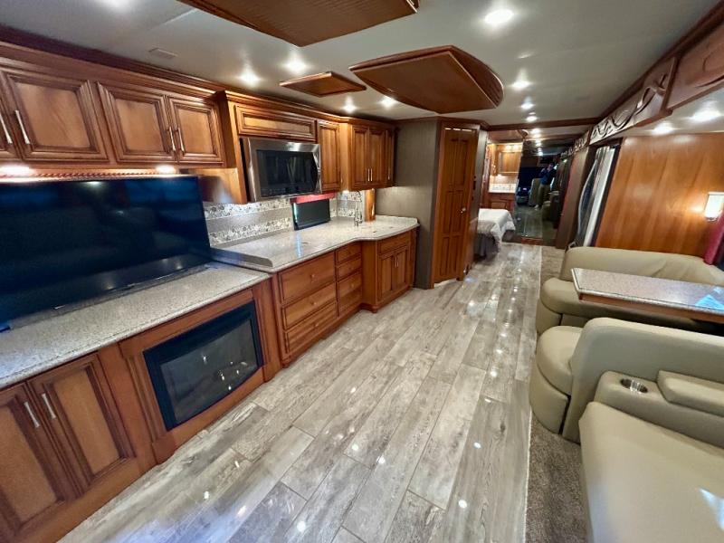 As you enter the coach, the full wall slide features a 74" hide-a-bed sofa, booth dinette, refrigerator, and pantry for your non-perishables, plus in the bedroom there are two wardrobes, chest of drawers, and an overhead TV. On the opposite side of the motor home there is a double kitchen sink on an angled countertop, three burner range, fireplace with LED TV on a power lift, and overhead cabinets stretching the whole length of the slide out.