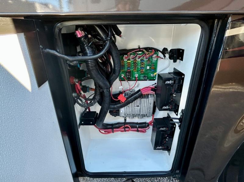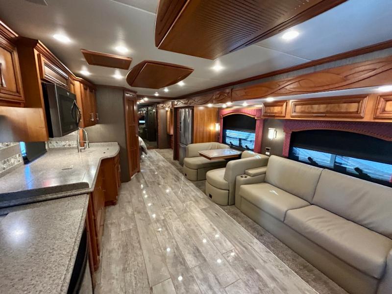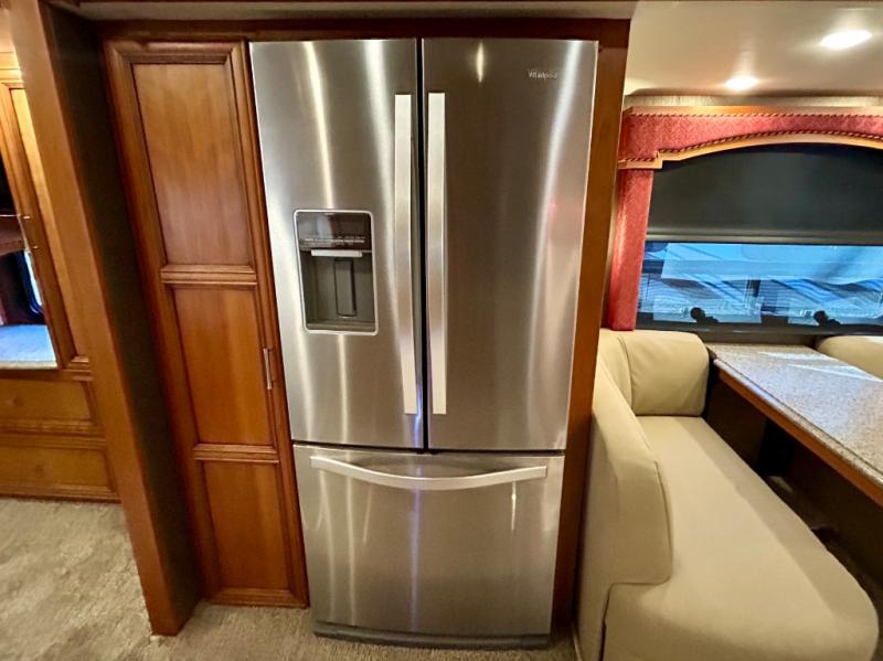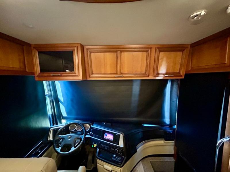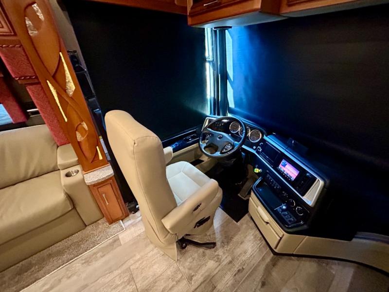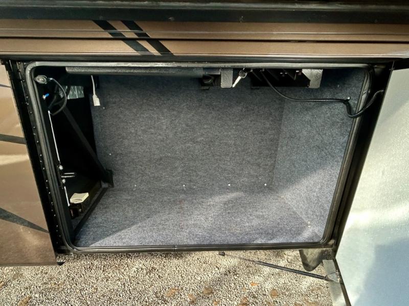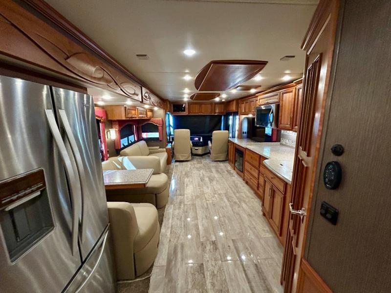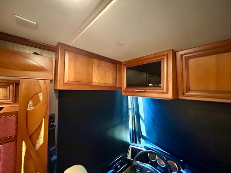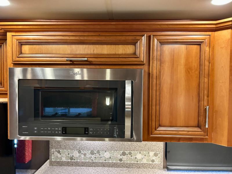 As you enter the coach, the full wall slide features a 74" hide-a-bed sofa, booth dinette, refrigerator, and pantry for your non-perishables, plus in the bedroom there are two wardrobes, chest of drawers, and an overhead TV. On the opposite side of the motor home there is a double kitchen sink on an angled countertop, three burner range, fireplace with LED TV on a power lift, and overhead cabinets stretching the whole length of the slide out.