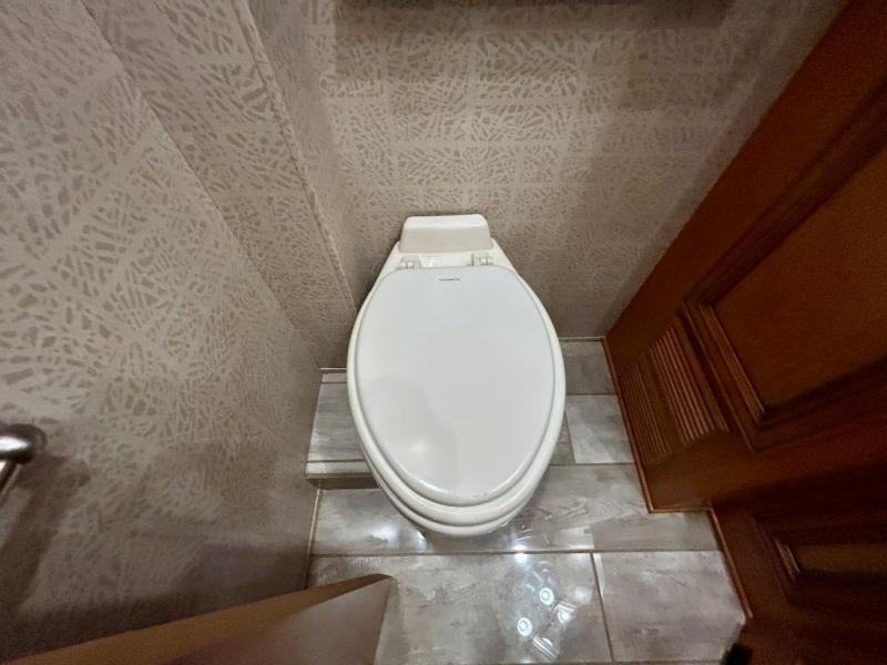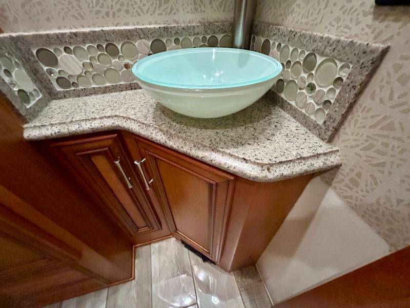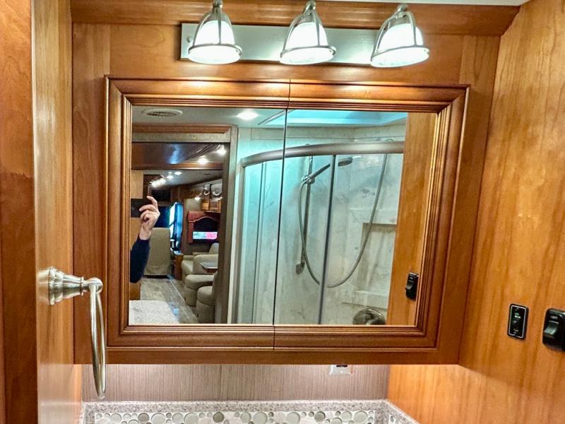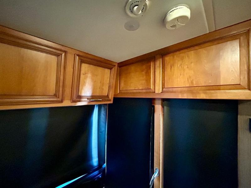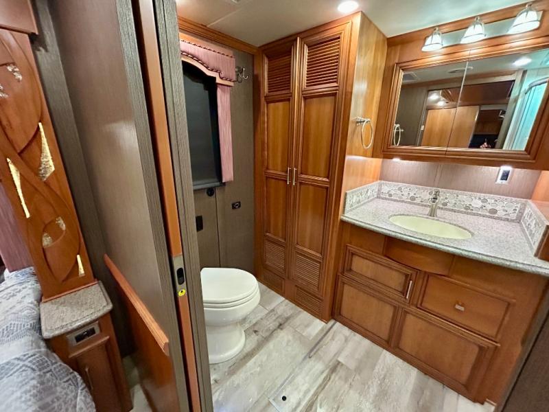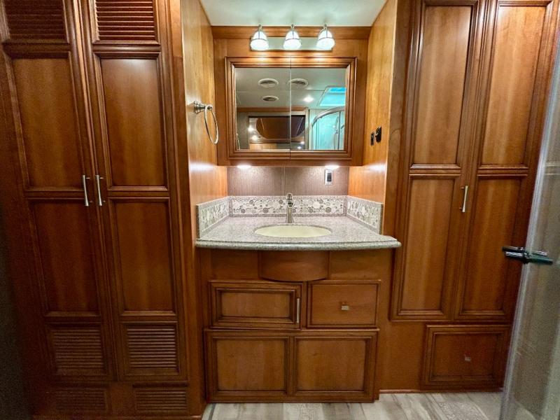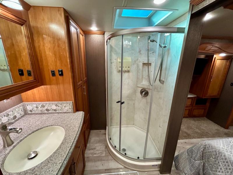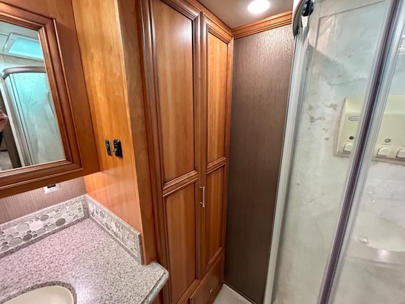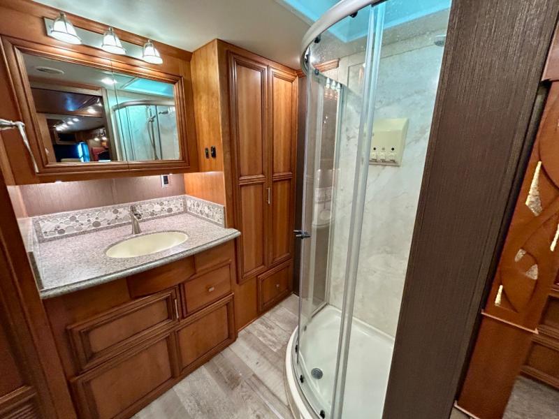 The walk through bedroom has a queen bed slide with nightstands on each side. In the rear of the coach is the master bath. There is a 36" corner shower and toilet, plus a wardrobe with bi-fold doors, sink with overhead cabinet, and wardrobe or washer and dryer along the rear wall, and so much more!