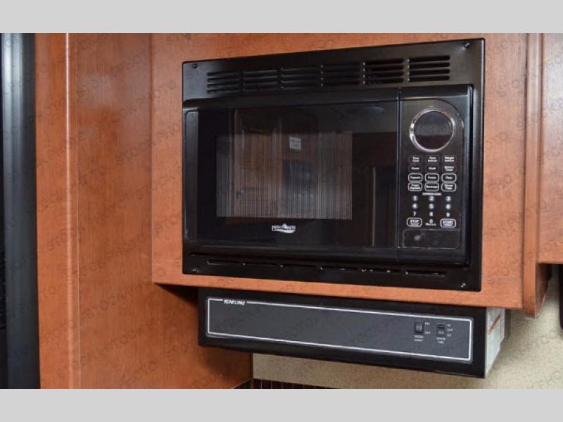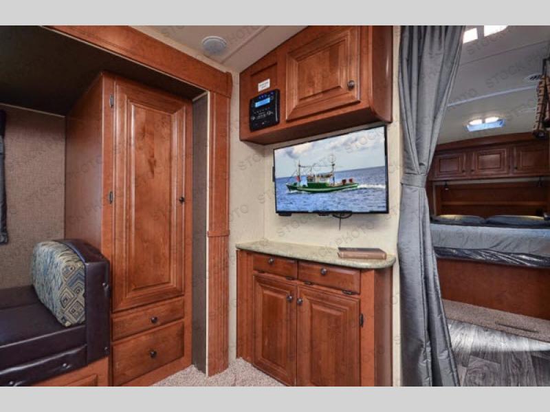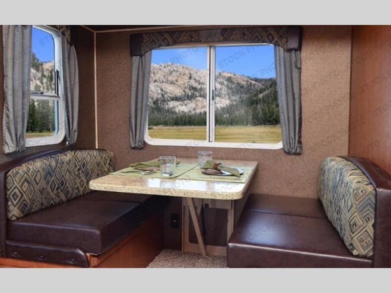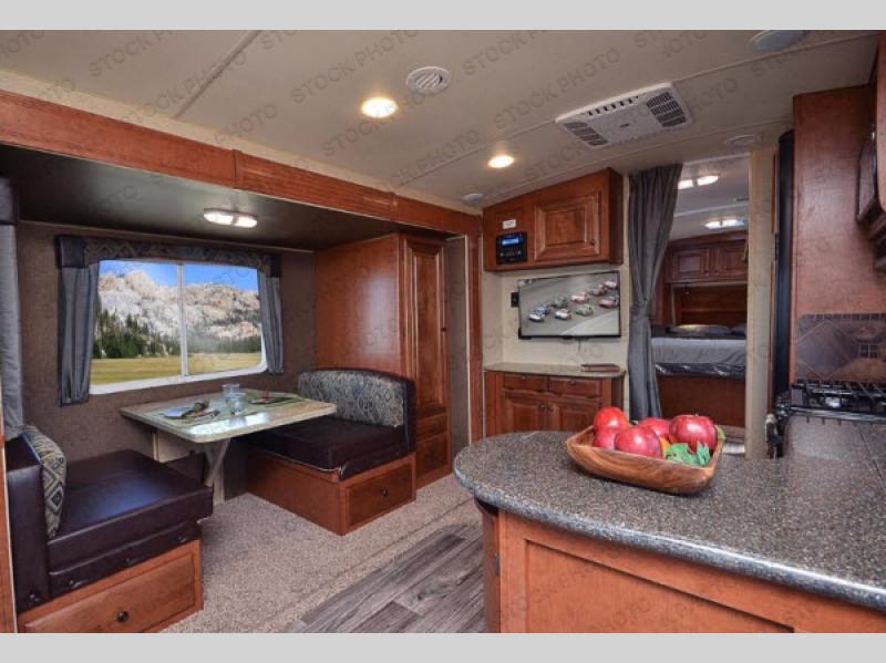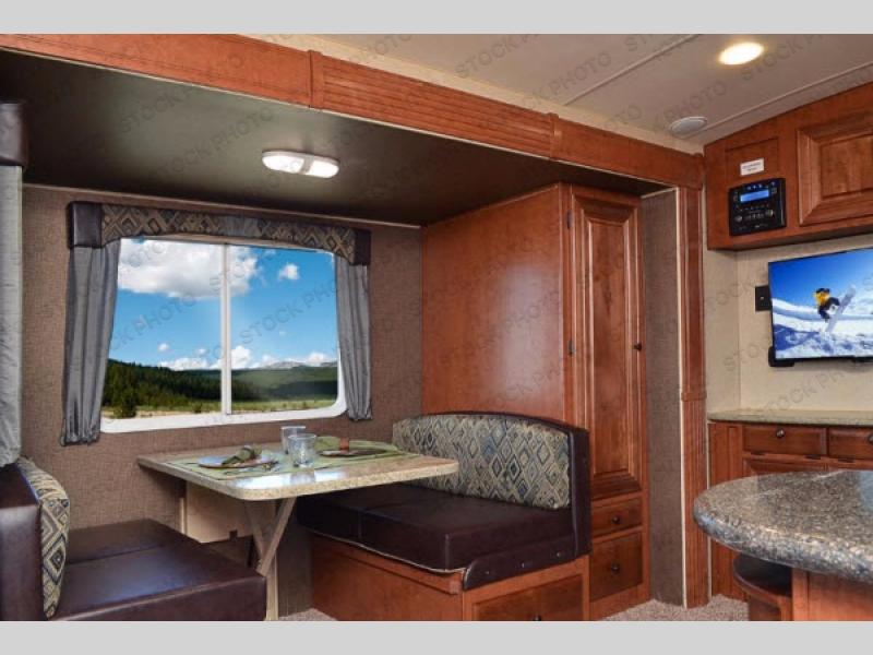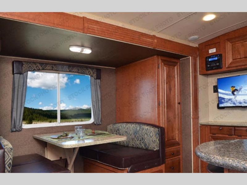 Continuing around, a slide out includes a booth dinette, overhead cabinets, a pantry and exterior access storage. Along the interior wall there is an entertainment center.