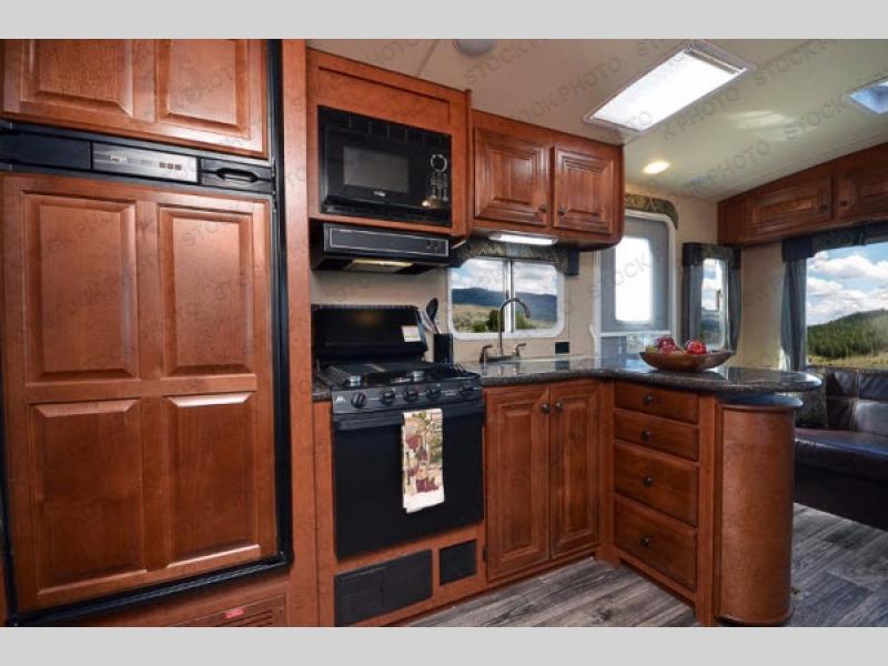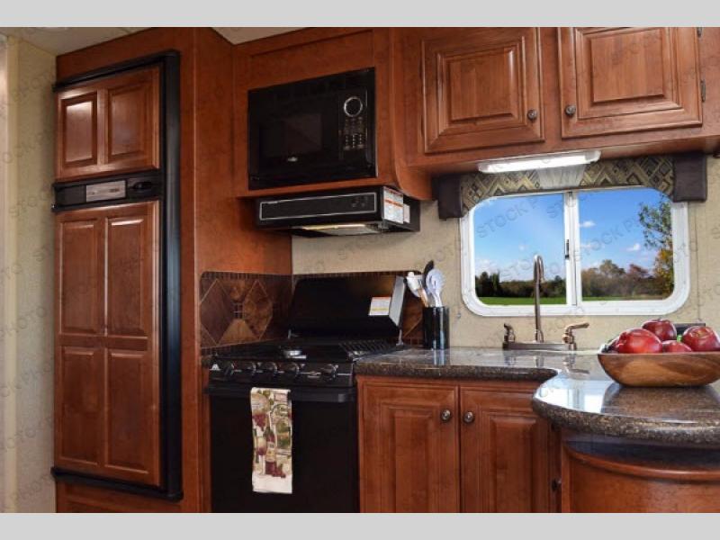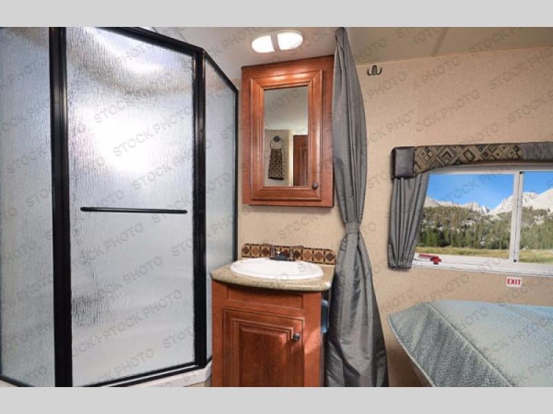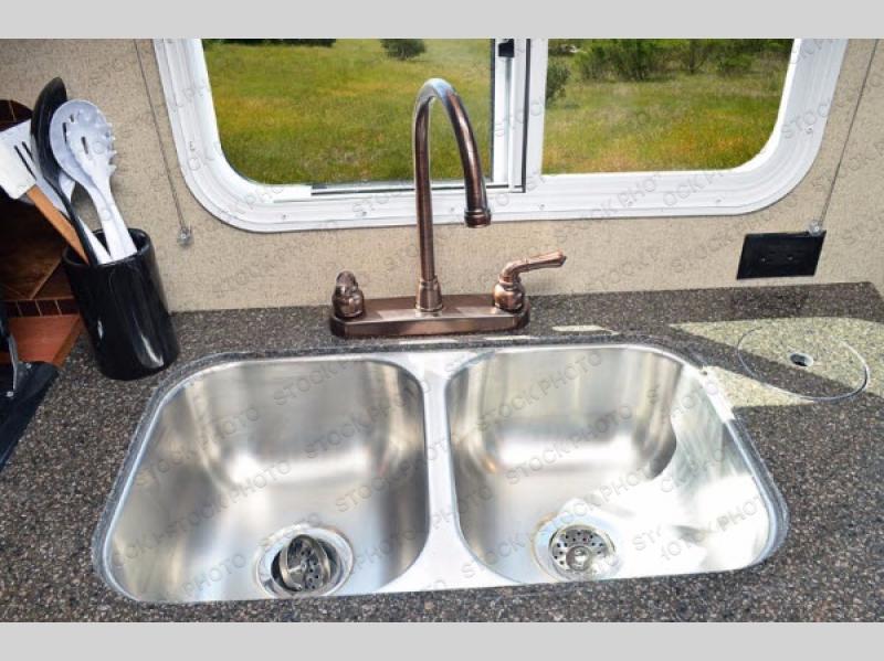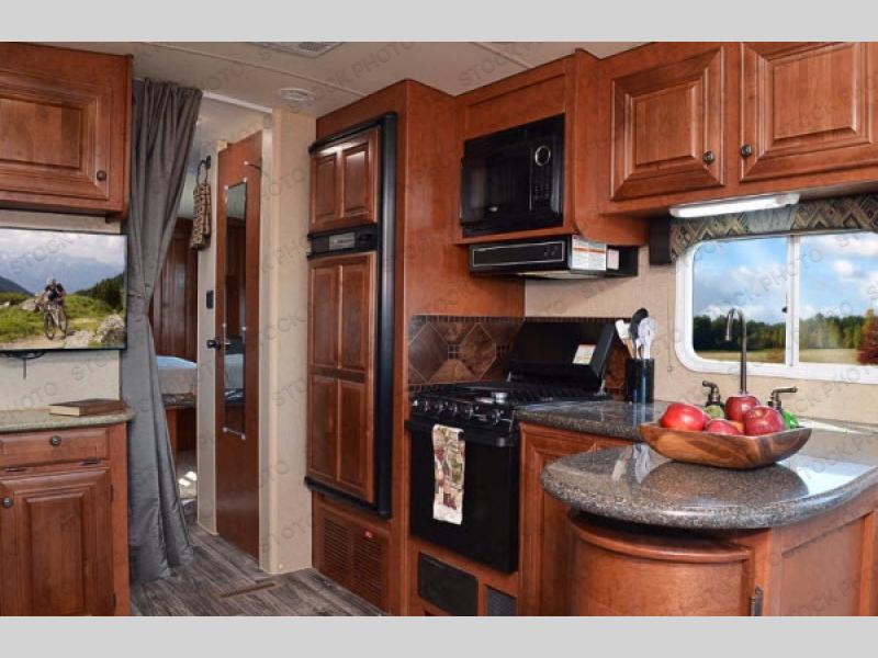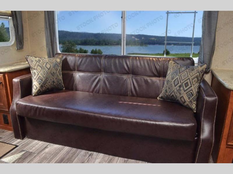 Northwood Mfg. offers the Arctic Fox 25Y with rear living and dual entry. As you enter at the back door of this travel trailer, a sofa, two end tables and overhead cabinets fill the rear wall.