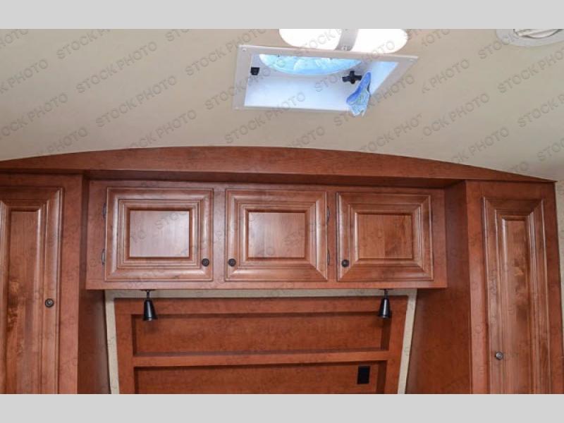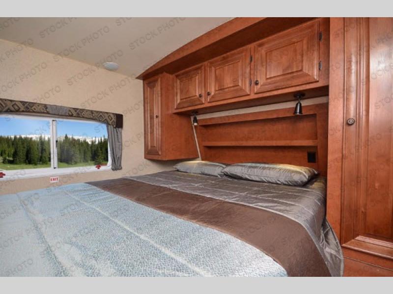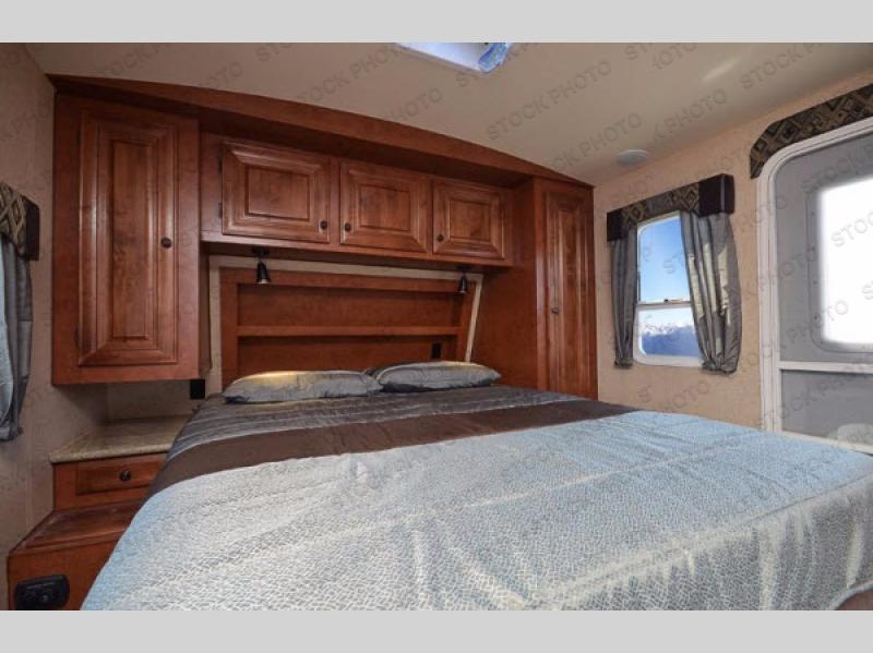 The master bedroom includes a privacy divider, a queen bed, nightstands on each side, overhead cabinets and a private entry door from the outside, plus more!