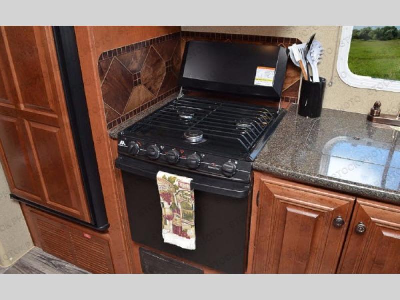 The kitchen is along the opposite side and includes L-shaped counters, a double kitchen sink, overhead cabinets, a three burner range, and a refrigerator.