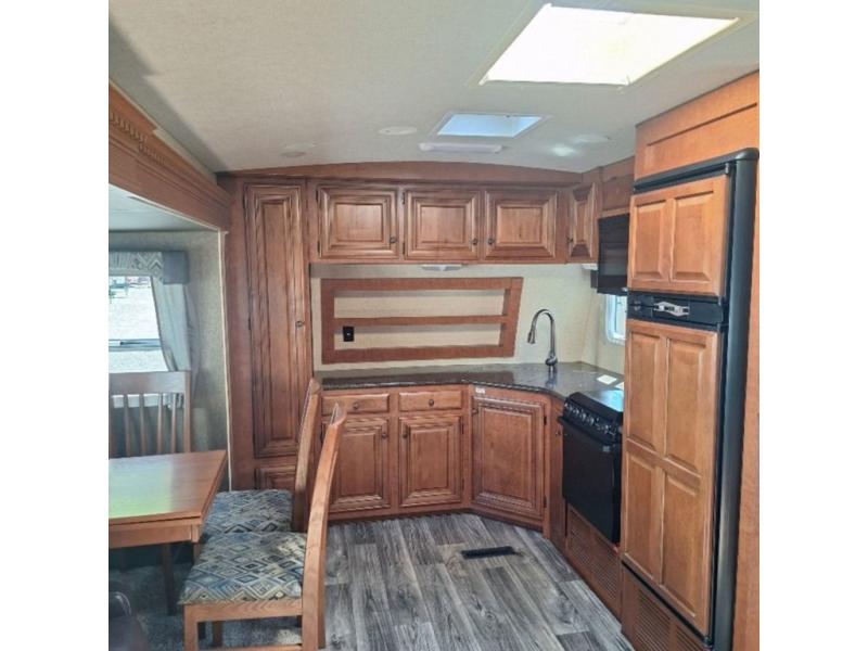 As you enter the main entrance towards the front of this travel trailer, the kitchen begins then wraps around the corner to the front of the trailer. It includes a refrigerator, a three burner range, an angled double sink, and lots of counter space and overhead cabinets along both the side and front wall. A wardrobe is in the far corner.