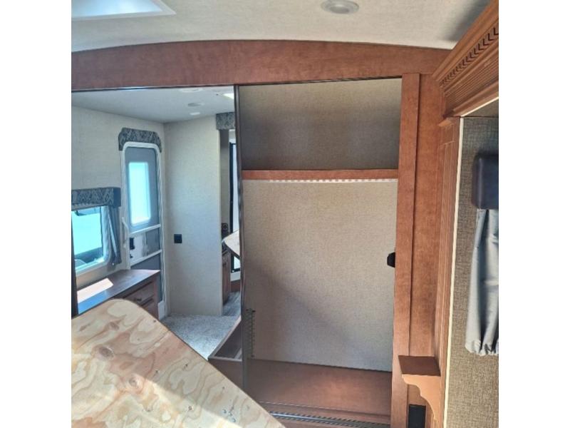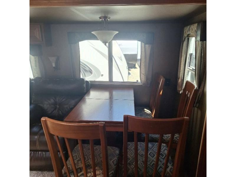Continuing around a slide out provides a free standing dinette with four chairs and a jackknife sofa with overhead cabinets. There is also an optional swivel rocker just inside the travel trailer. Across from the chair, to the left of the entry door, there is a TV cabinet with a TV and a coat rack.