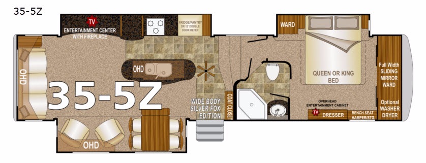 The front private bedroom includes a slide with a wardrobe, a queen bed and nightstands. You may choose an optional king size bed. There is a dresser on the wall opposite the bed. Along the front wall is a sliding mirror wardrobe and a washer/dryer closet or wardrobe in the corner.