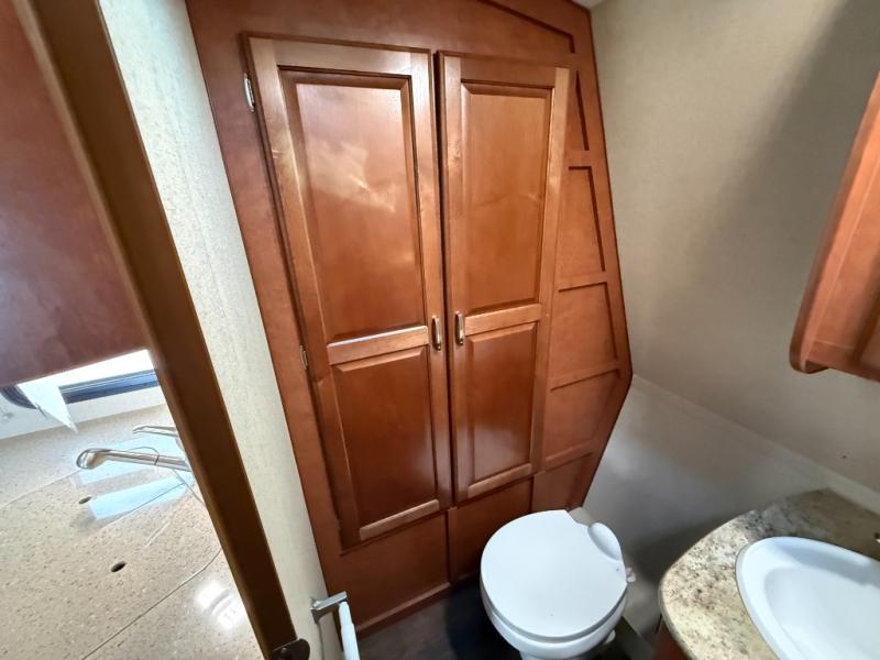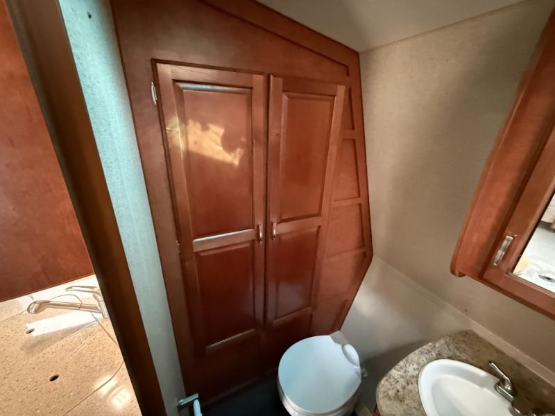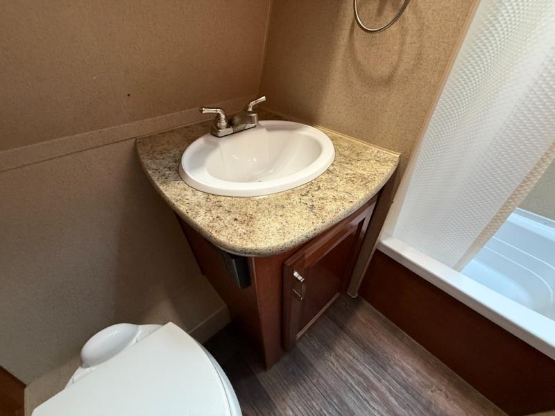 Step into the Desert Fox 21 SW toy hauler travel trailer to find a front bath and an electric lift bed at the rear.