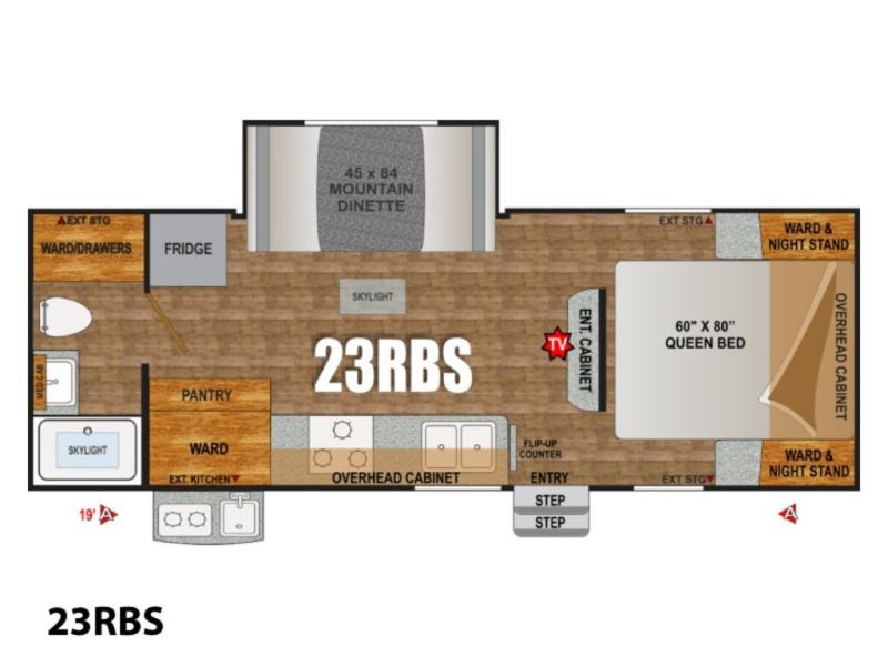 The single slide out includes a mountain dinette for eating meals, playing games, or even sleeping. You can enjoy the entertainment center and TV located on the interior wall from this combined space.