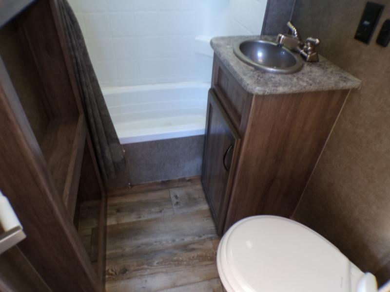 A road side bath can be found almost directly across from the main entry door and features a tub/shower, toilet, sink, and linen cabinet.