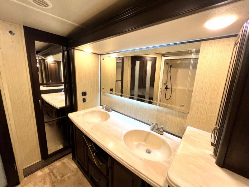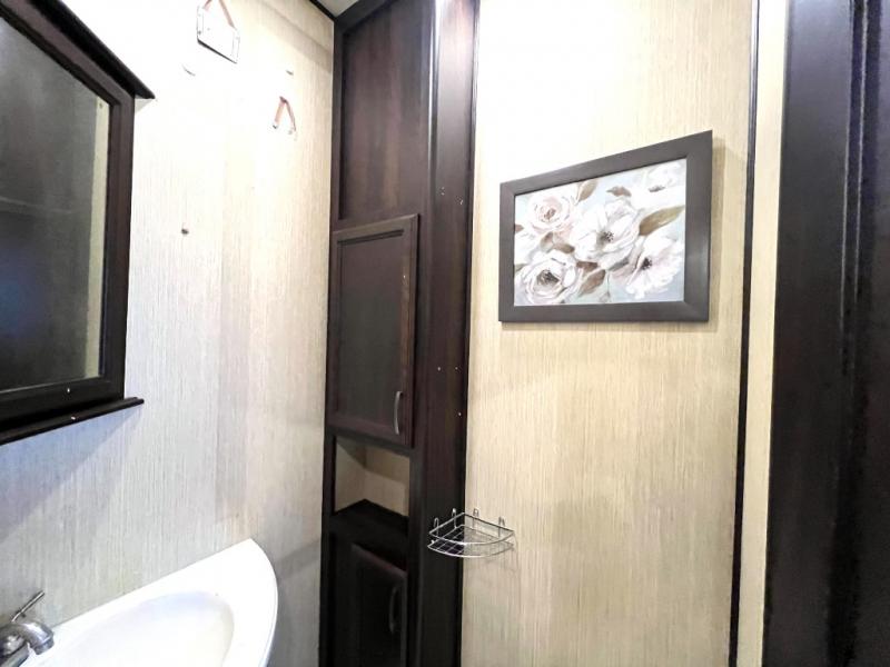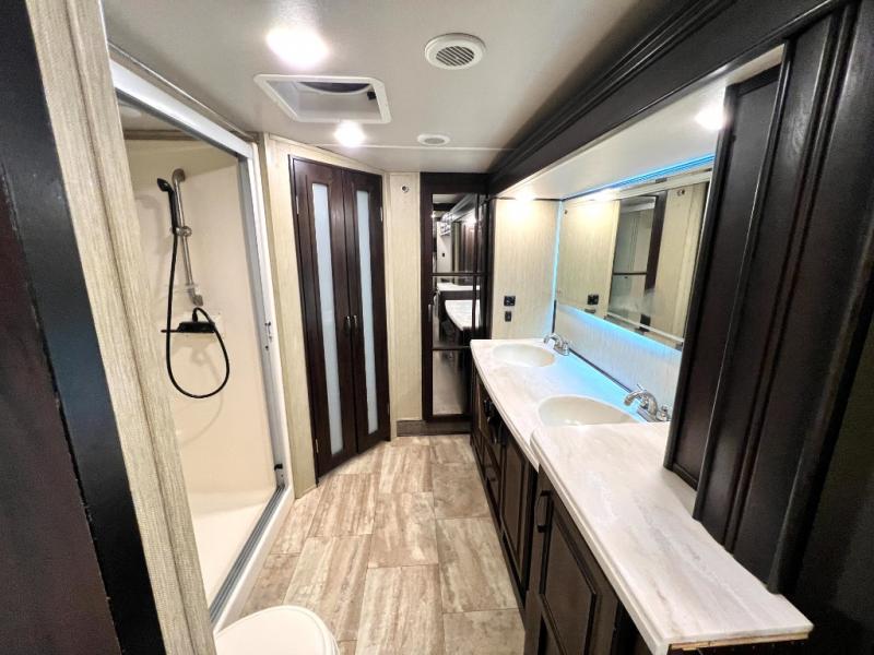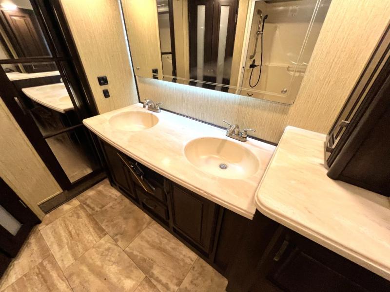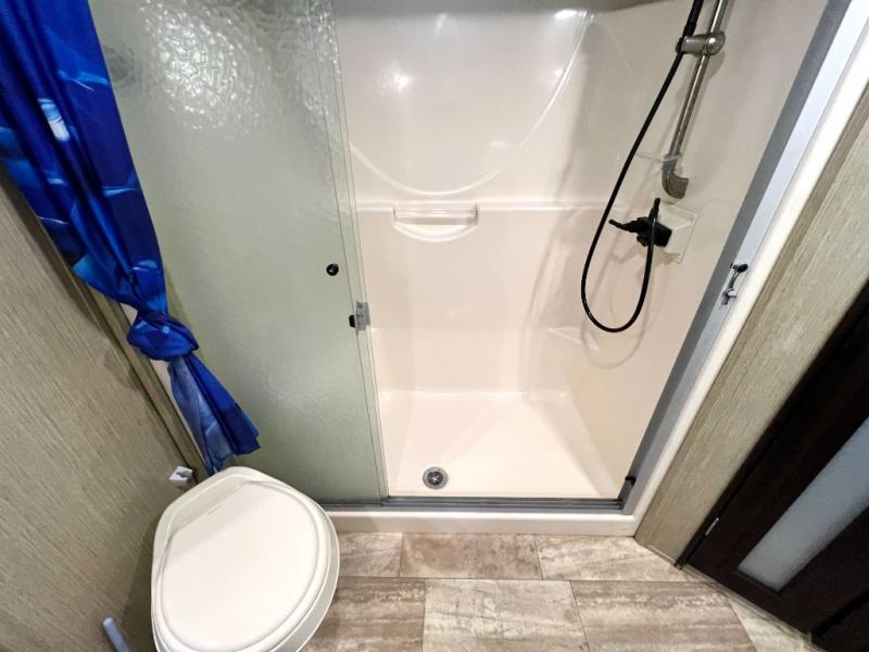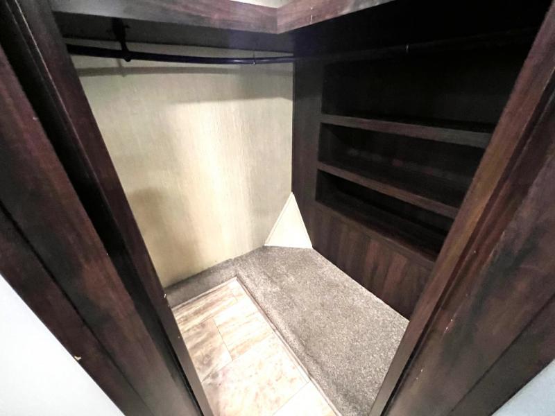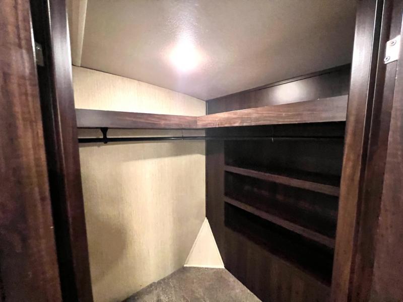 The master bedroom offers a spacious retreat including a queen slide out bed with nightstands on either side, or you may choose a king size bed instead. There is also an entertainment center along the opposite wall for watching your late night television or movie while in bed. Through a sliding door you will find a master bath that is very spacious featuring a double vanity slide with linen storage, a 60" x 30" walk-in shower, a walk-in closet, plus you can add an optional washer and dryer if you like.