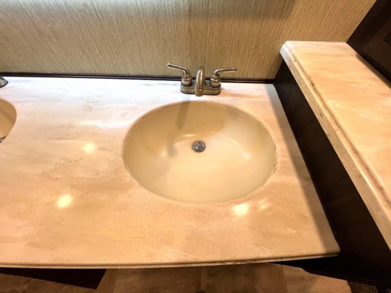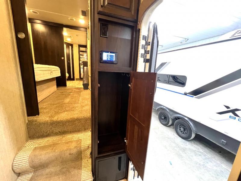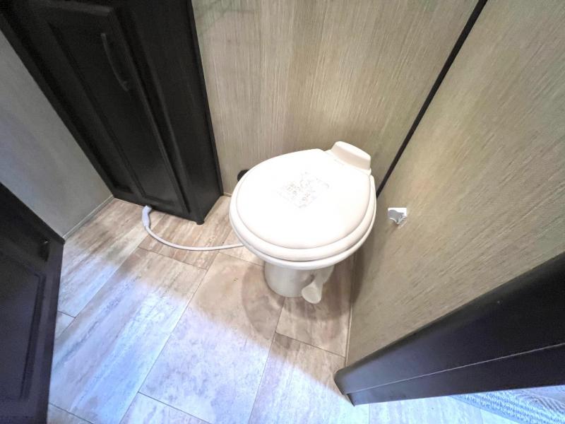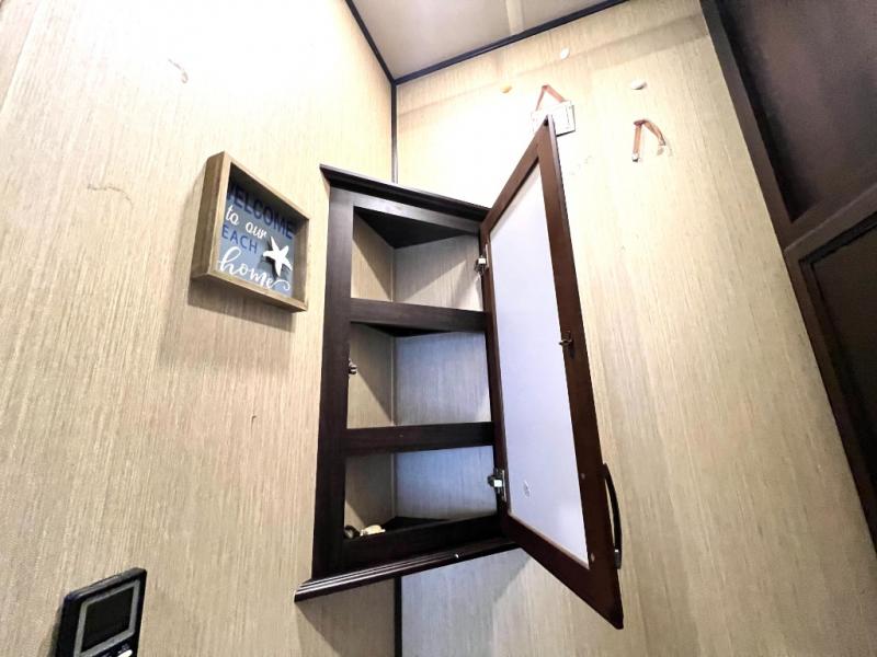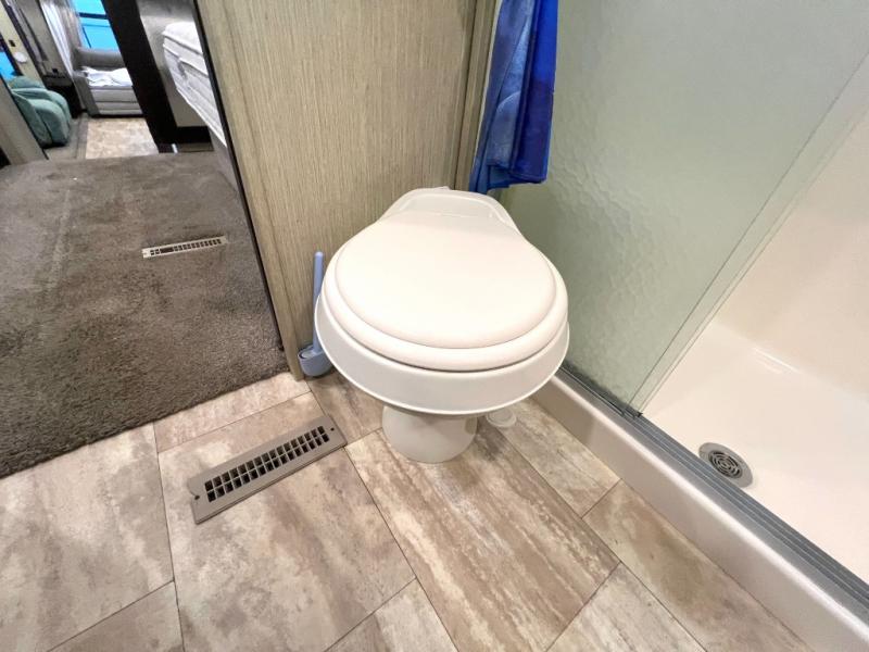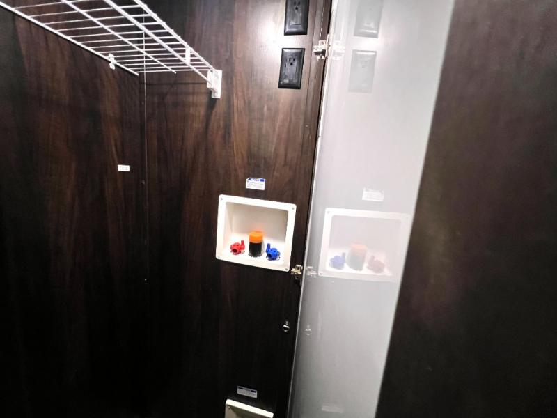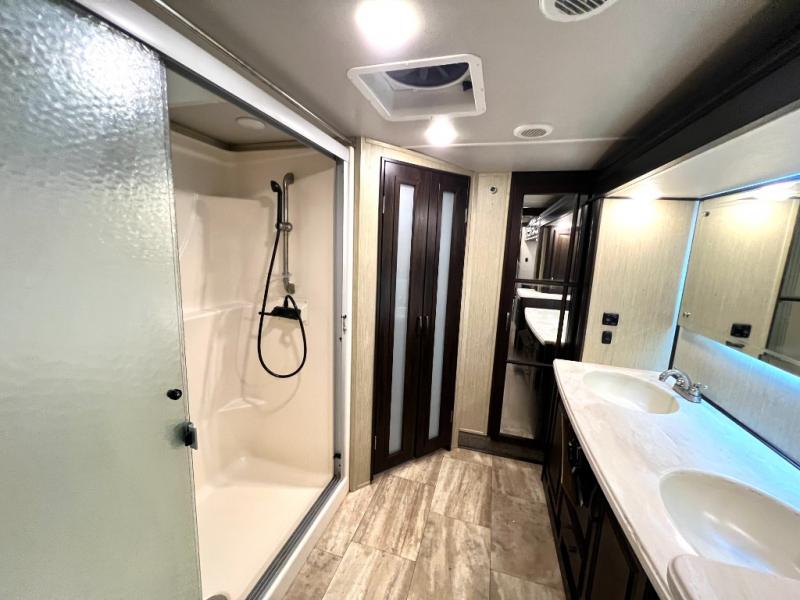 The master bedroom offers a spacious retreat including a queen slide out bed with nightstands on either side, or you may choose a king size bed instead. There is also an entertainment center along the opposite wall for watching your late night television or movie while in bed. Through a sliding door you will find a master bath that is very spacious featuring a double vanity slide with linen storage, a 60" x 30" walk-in shower, a walk-in closet, plus you can add an optional washer and dryer if you like.