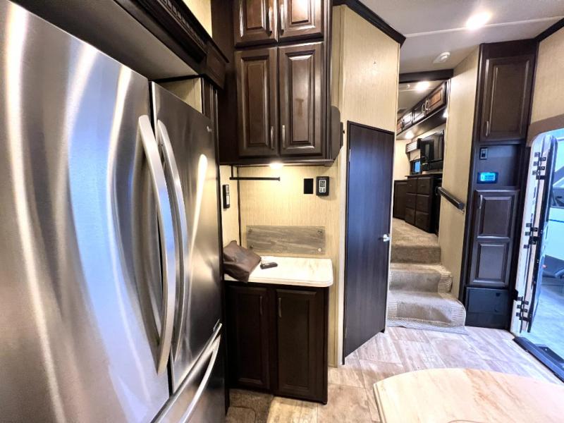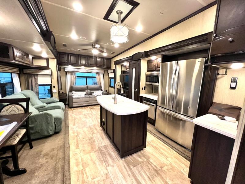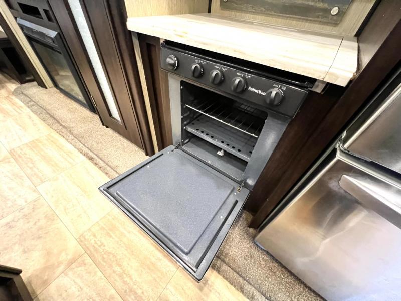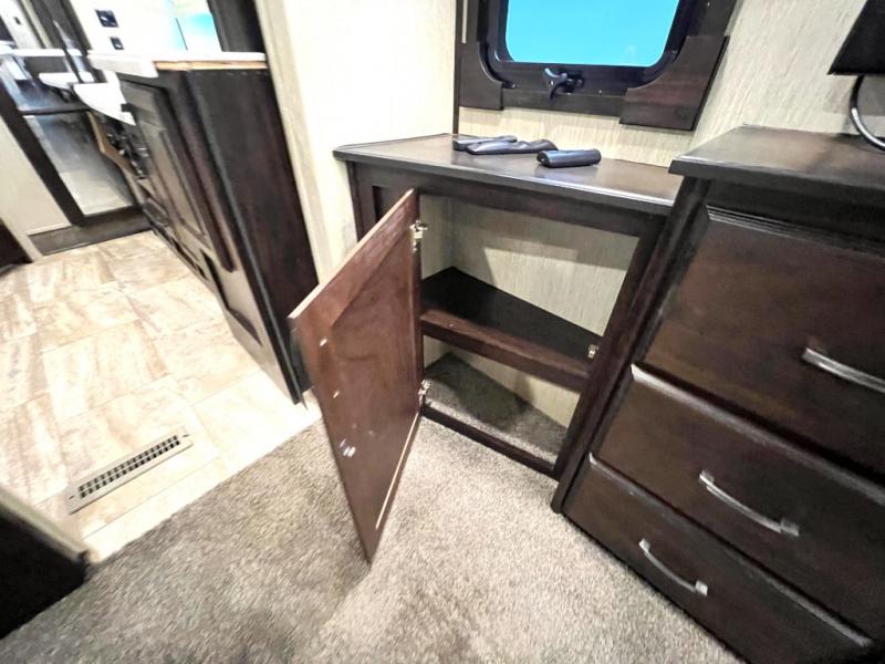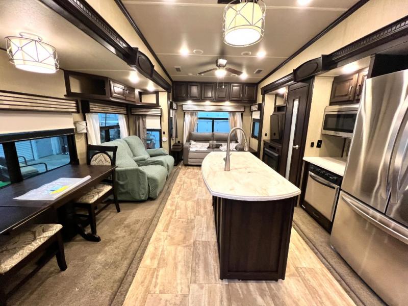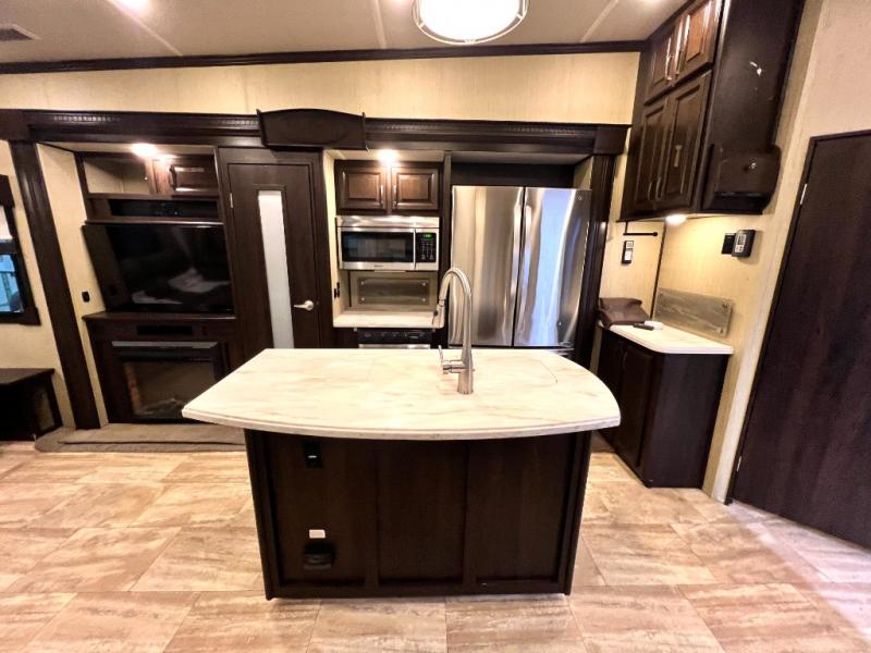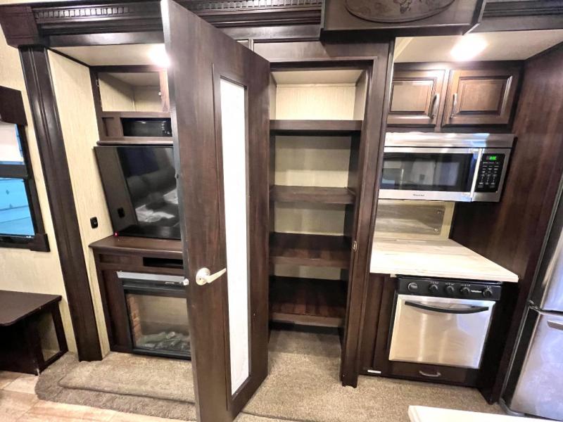 Head back through the bedroom and down the steps to the main living area. There is a storage hutch to your right. The road side slide features a refrigerator, a three burner range, microwave, walk-in pantry, and entertainment center with an optional electric fireplace. Opposite the kitchen and to the left of the entry door there is a slide out dining table with four chairs, and theater seating for two with overhead cabinets. There is also a center island with a double kitchen sink and more storage for your pots and pans.