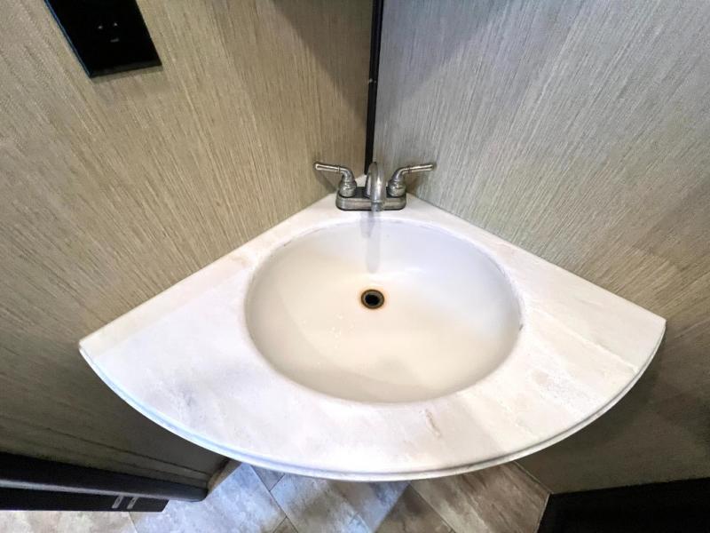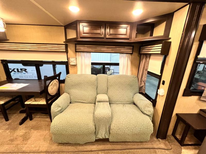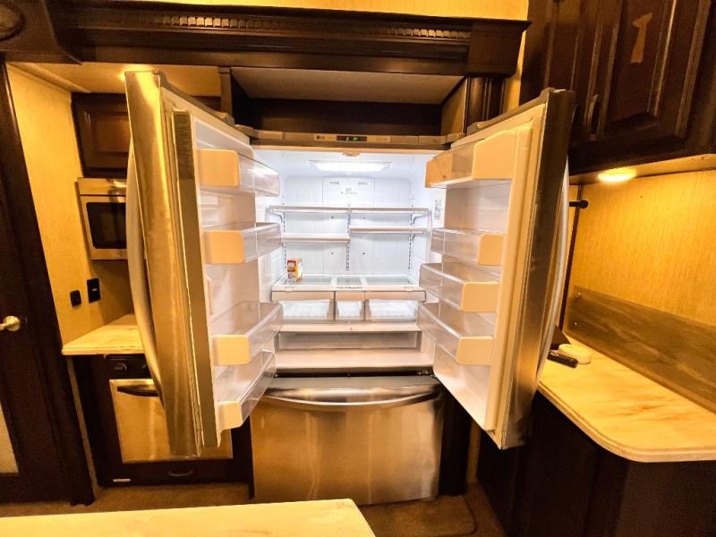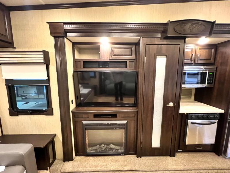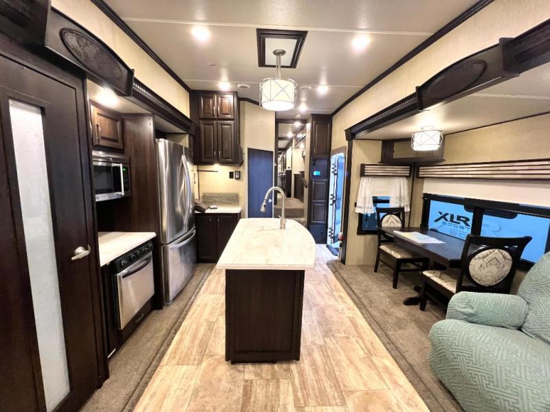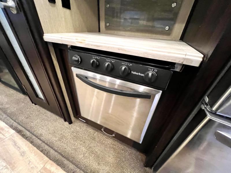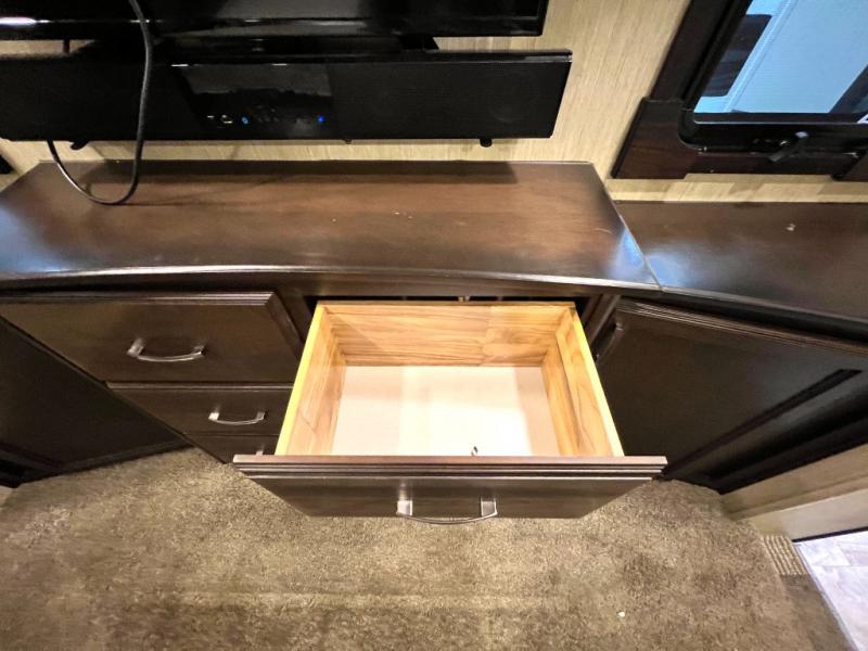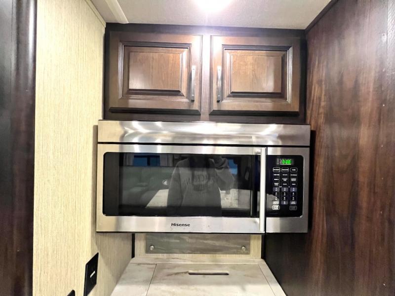 Head back through the bedroom and down the steps to the main living area. There is a storage hutch to your right. The road side slide features a refrigerator, a three burner range, microwave, walk-in pantry, and entertainment center with an optional electric fireplace. Opposite the kitchen and to the left of the entry door there is a slide out dining table with four chairs, and theater seating for two with overhead cabinets. There is also a center island with a double kitchen sink and more storage for your pots and pans.